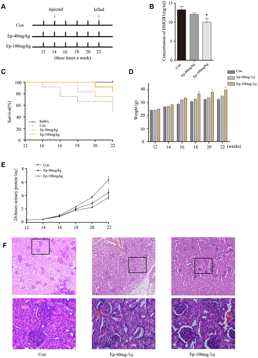 Previous study revealed that HMGB1 inhibition by a specific antibody could ameliorate albuminuria in MRL/lpr lupus-prone mice [13]. EP treatment significantly reduced circulating levels of HMGB1 in animals models and had protective effect [14]. Therefore, to further determine the effect of EP on MRL/lpr mice, mice were treated with EP according to the experimental design (Figure 5A). As expected, the expression of HMGB1 declined in serum of Ep-100mg/kg group, and the expression of HMGB1 in serum of Ep-40mg/kg group decreased moderately (Figure 5B). The survival rates in Ep-100mg/kg group were higher than that in saline solution-treated group (Figure 5C). The weight of the mice in Ep-40mg/kg group and Ep-100mg/kg group gradually increased (Figure 5D). The 24-hours urinary protein in these two groups were lower than those in control group (Figure 5E). In terms of pathology, glomerular sclerosis and interstitial fibrosis were ameliorated in Ep-100mg/kg group (Figure 5F). These results demonstrated EP had a significant therapeutic effect on LN by inhibiting HMGB1 in MRL/lpr mice.