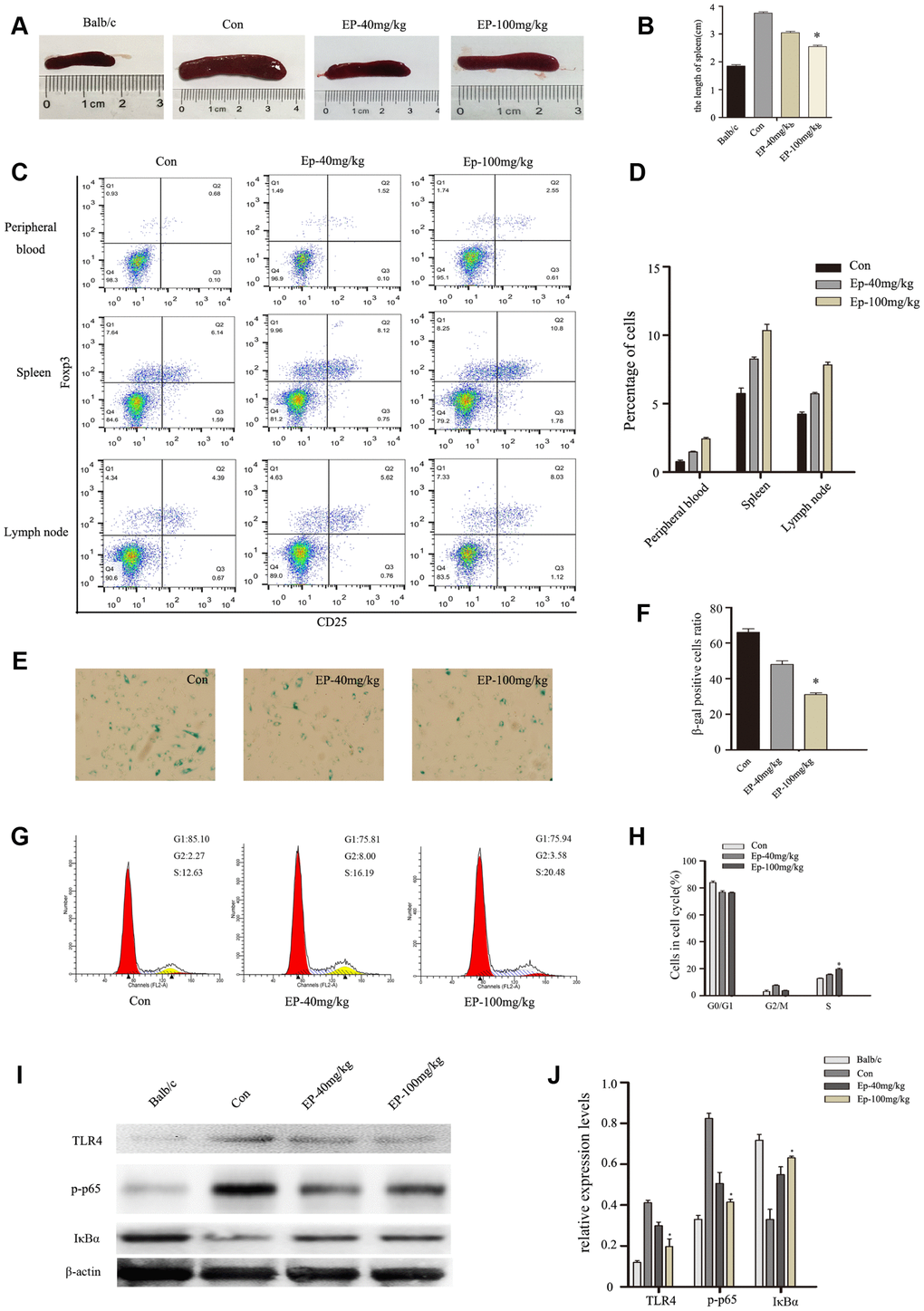 In the present study, we examined the influence of EP intraperitoneal injection on immune response of MRL/lpr mice, especially Treg immune. As shown in Figure 6A–6B, the size of spleen was significantly reduced in Ep-100mg/kg group. At the same time, EP treatment upregulated the number of Treg cells in peripheral blood, spleen, lymph nodes (Figure 6C, 6D). BM-MSCs from MRL/lpr mice showed senescent behavior, characterized by flattened and enlarged cell morphology, increased SA-β-gal activity, and cell cycle arrest. Interestingly, we observed decelerated cell senescence signs in BM-MSCs in Ep-100mg/kg group (Figure 6E, 6F). Cell-cycle data showed that BM-MSCs from MRL/lpr mice treated by EP displayed a significantly lower number of cells arrested in the G0/G1 phase compared with the control group (Figure 6G, 6H). Next, we investigated the expressions of TLR4, p-p65, and IκBa in MSCs from MRL/lpr mice, normal group and EP-treated group by Western blot analysis. We found higher levels of TLR4 and p-p65 in MSCs from MRL/lpr mice compared to the EP-treated group (Figure 6I, 6J). These results revealed that EP might be an effective therapeutic approach to SLE.
