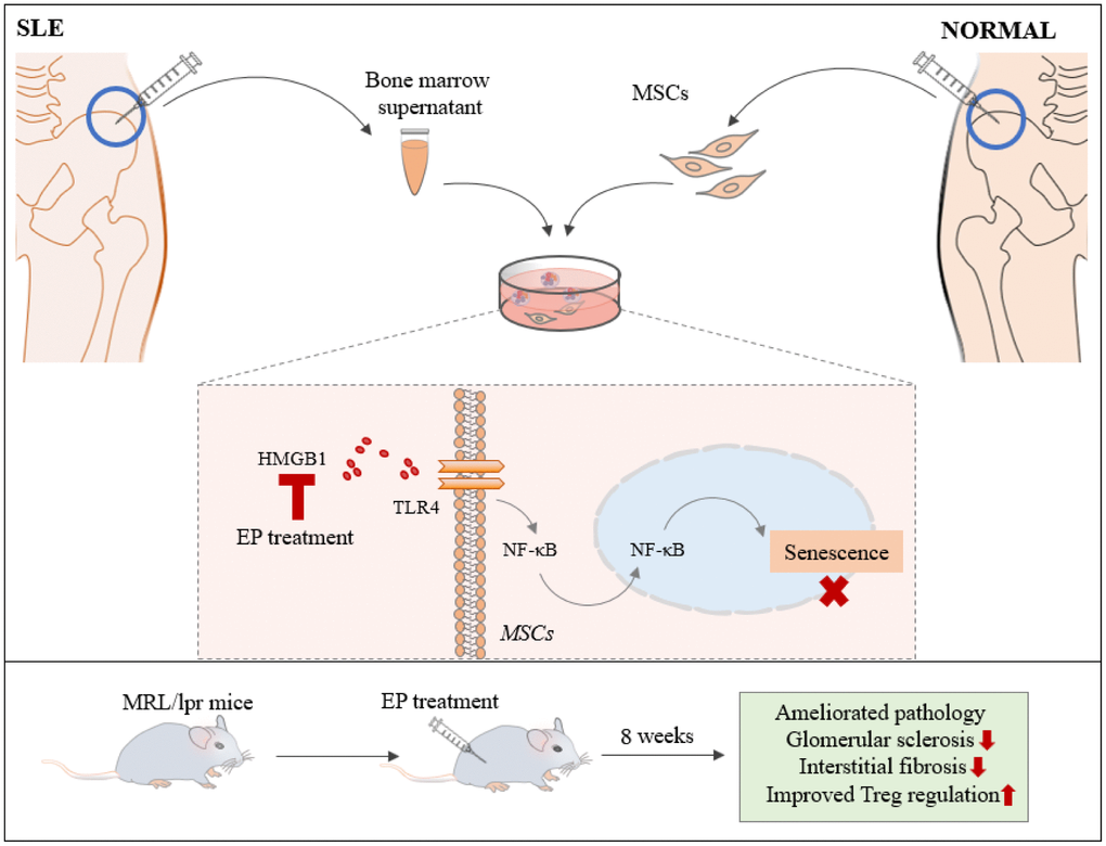 Taken together, our data showed that HMGB1 in SLE bone marrow inflammatory microenvironment could promote the senescence of MSCs via TLR4/NF-κB signaling pathway, and inhibiting HMGB1 by EP could improve lupus nephritis and reverse the senescence signs. Taken with the current data, HMGB1 blockade might be a potential target for treating human SLE.