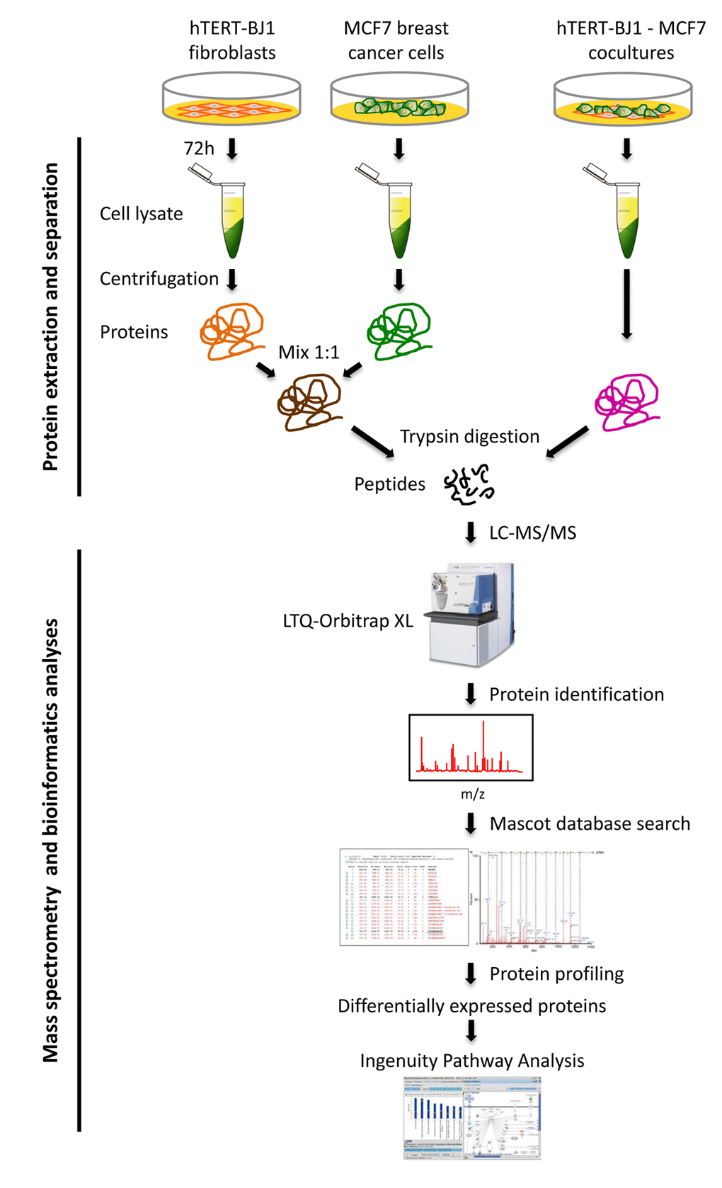 Here, we developed a new approach to identify these potential therapeutic targets, via unbiased proteomics analysis. For this purpose, we used MCF7 cells, an ER(+) human breast cancer cell line, as a model system. These MCF7 cells were co-cultured with hTERT-BJ1 fibroblasts, in a cellular ratio of 1:1, for a short 3-day period. These MCF7-fibroblast co-cultures were then directly compared to a 1:1 protein mixture of MCF7 cells and hTERT-fibroblasts, that had not been co- cultured together, but were grown instead as homotypic mono-cultures (Figure 1).