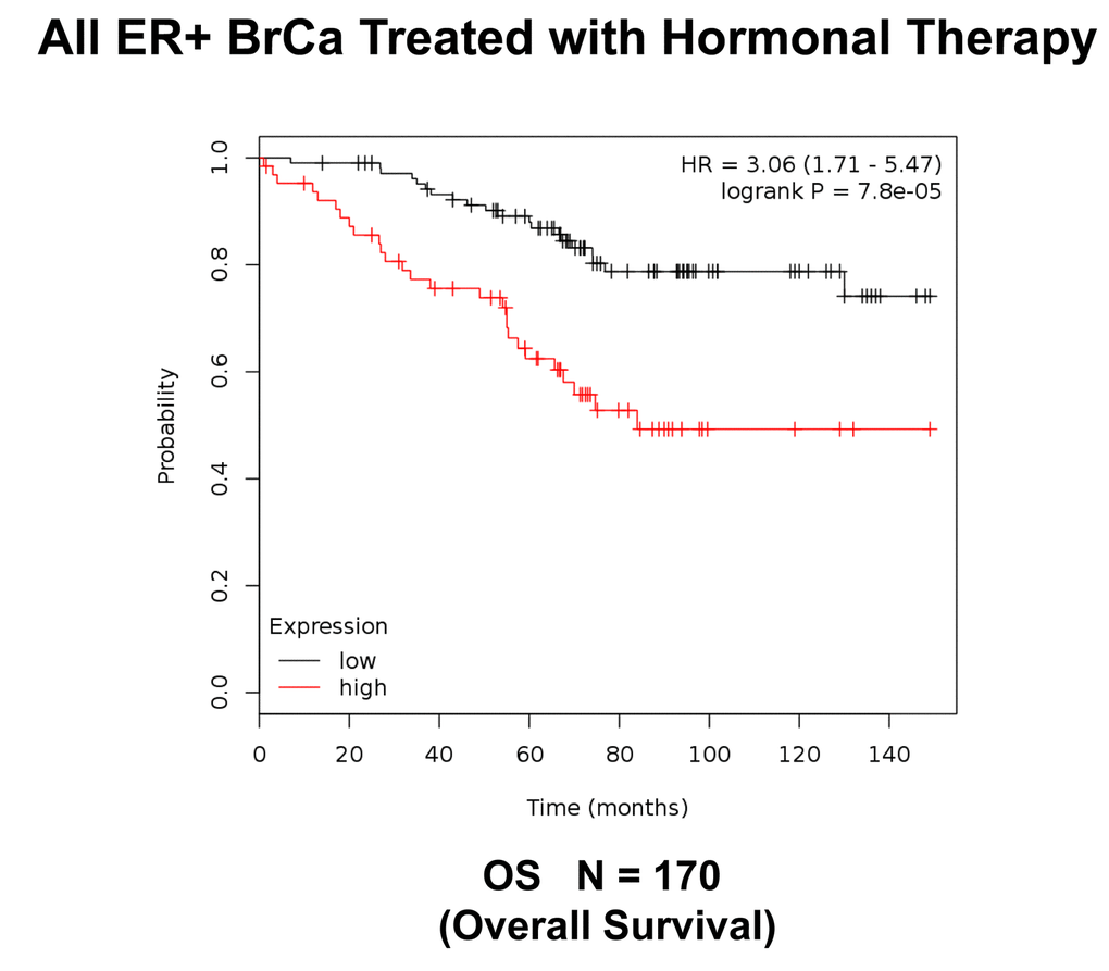 Next, we assessed the behavior of this Mito-Signature in predicting overall survival. Figure 10 shows that it was also highly predictive of overall survival during hormonal therapy (HR = 3.06; p = 7.8e-05; N = 170 patients).