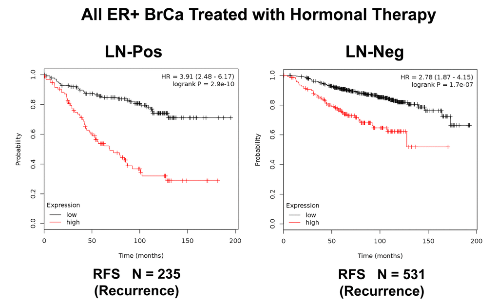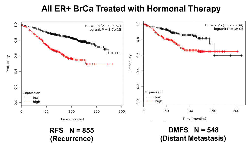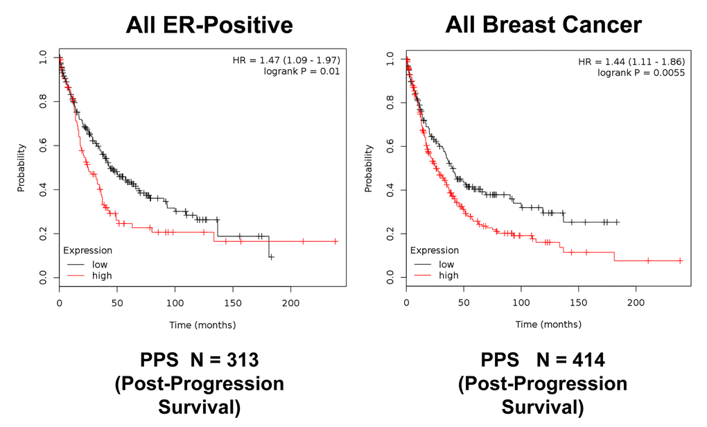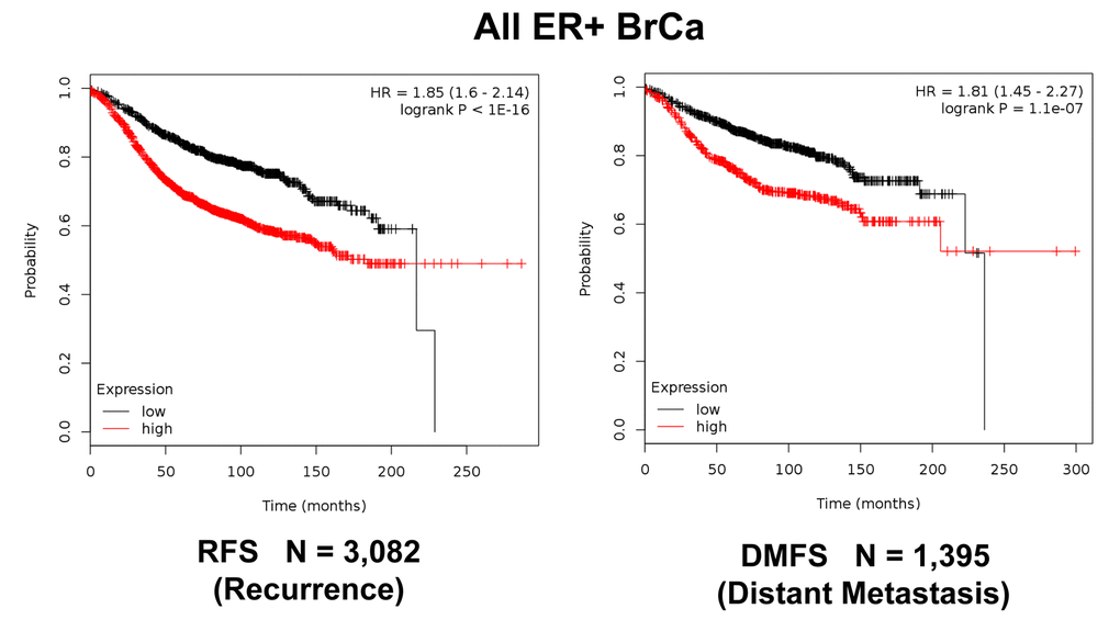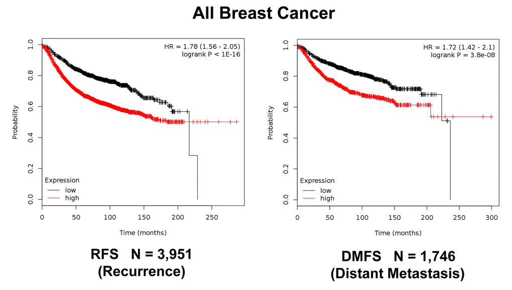 Moreover, Figure 11 shows that this Mito-Signature was also effective in all ER(+) breast cancer patients in predicting tumor recurrence (N = 3,082), as well as distant metastasis (N = 1,395). Similar results were obtained using data from all breast cancer patients, for recurrence (N = 3,951) and metastasis (N =1,746), as well as for post-progression survival (Figures 12 and 13). Thus, this mitochondrial-based gene signature may represent an important new prognostic tool for predicting patient outcomes, in a wide variety of different breast cancer patients, but especially in ER(+) patients treated with hormonal therapies.