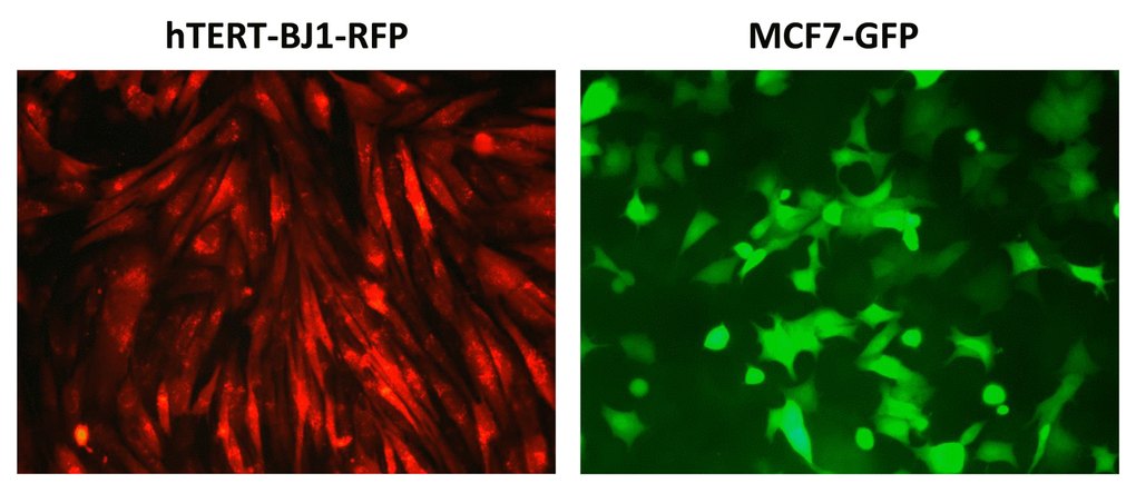 To directly test this hypothesis, we developed an assay system to monitor the sensitivity of cancer cells to drug treatment, in the presence or absence of fibroblasts. For this purpose, we generated hTERT-BJ1-fibroblasts expressing RFP (red fluorescent protein) and MCF7 cells expressing GFP (green fluorescent protein). Representative images of these mono-cultures are shown in Figure 14.