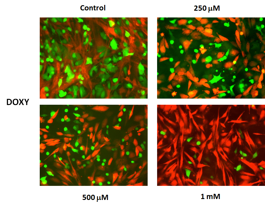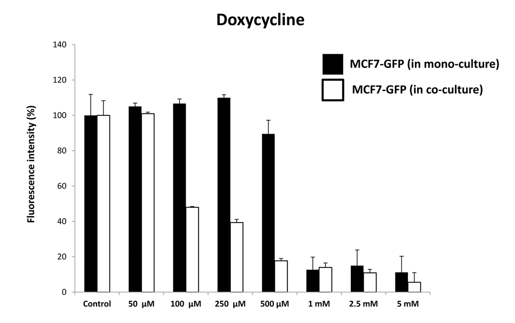 hTERT-BJ1-RFP cells and MCF7-GFP cells were first generated by stable transduction with lenti-viral vectors. Then, these cells were plated into clear flat bottom 96- well black microplates (Corning; CLS3603). Mono- cultures were generated by plating either hTERT-BJ1- RFP (8,000 cells/well) or MCF7-GFP cells (8,000 cells/well). In parallel, co-cultures were generated by co-plating hTERT-BJ1-RFP (6,000 cells/well) with MCF7-GFP (2,000 cells/well). The next day, the plates were treated with either Doxycycline or Azithromycin (or vehicle controls) and were incubated for 72 hours at 37oC. The cell culture plates were then read with a plate-reader at 545/590 nm (for RFP) and at 490/510 nm (for GFP). Background readings were subtracted from the fluorescent signal and data were then normalized to controls.