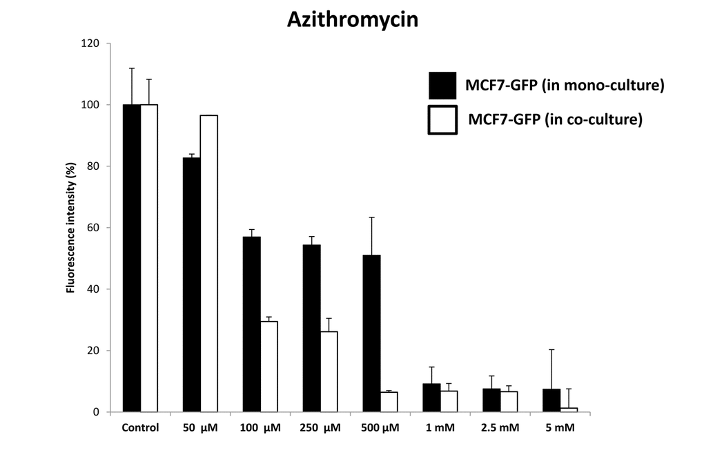 We hypothesized that certain FDA-approved antibiotics that target host protein synthesis and mitochondrial protein translation as off-target side effects might be able to sensitize MCF7 cells, under co-culture conditions. Interestingly, our results indicate that MCF7 cells in co-culture were ~5-fold more sensitive to the effects of Doxycycline and ~8-fold more sensitive to the effects of Azithromycin. Therefore, the targeting of mitochondrial protein translation via drug repurposing may be an effective anti-cancer strategy, especially under these more physiologically-relevant culture conditions, which includes a stromal tumor-micro-environment.