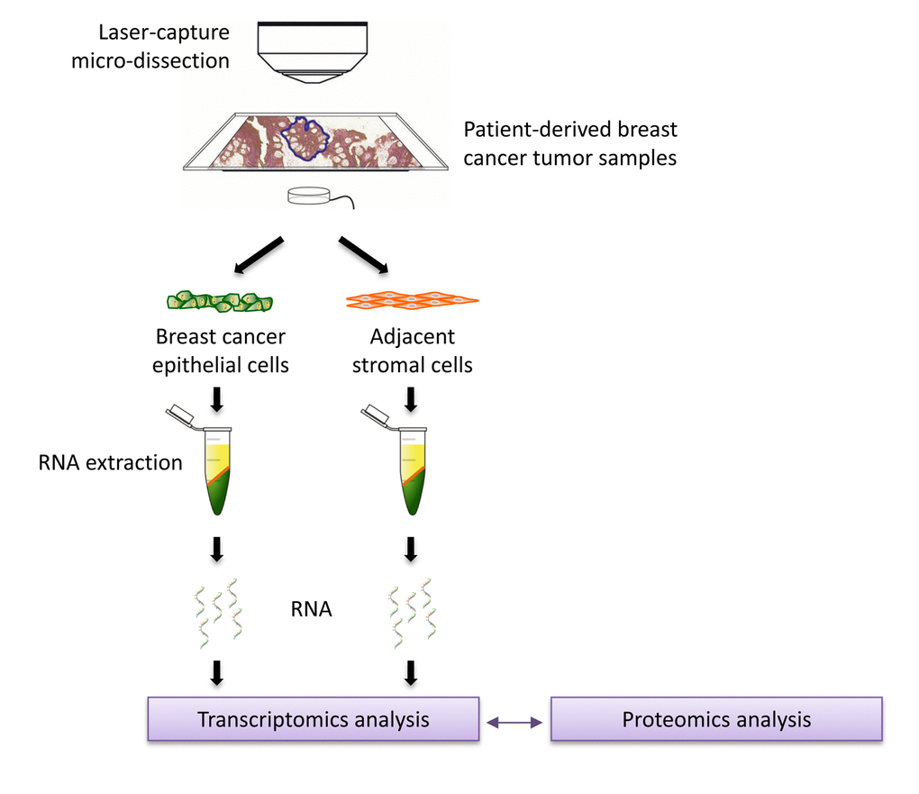 The specific candidate targets identified by proteomics analysis were then intersected with a wealth of publically-available clinical data, first to validate their expression in human breast cancer cells in vivo. These clinical samples were subjected to laser-capture micro- dissection to separate human breast cancer cells, from adjacent tumor stroma, before they were subjected to mRNA-based transcriptional profiling.