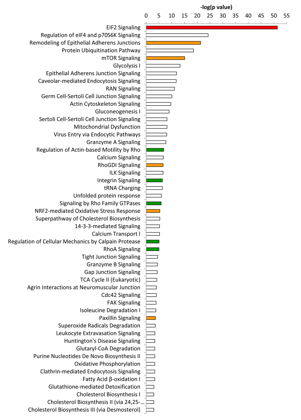 Differentially expressed proteins were also independently analyzed using Ingenuity Pathway Analysis (IPA), to identify altered canonical pathways and toxicity functions.