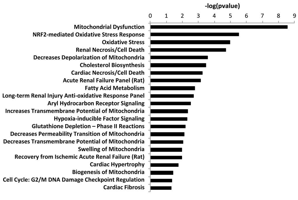 This analysis revealed that EIF2 signaling, which is crucial for protein synthesis, is a significantly activated canonical pathway in co-cultures, as compared to mono- cultures, as measured by a z-score > 2 (Figure 3). Other altered pathways and toxicity functions identified by IPA included mitochondrial dysfunction, NRF2- mediated oxidative stress, fatty acid metabolism, changes in mitochondrial membrane potential, HIF signaling, glutathione depletion, mitochondrial biogenesis, DNA-damage and fibrosis, among others (Figure 4). The observed similarity with renal injury appears to be related to an increase in oxidative stress and the resulting anti-oxidant response.