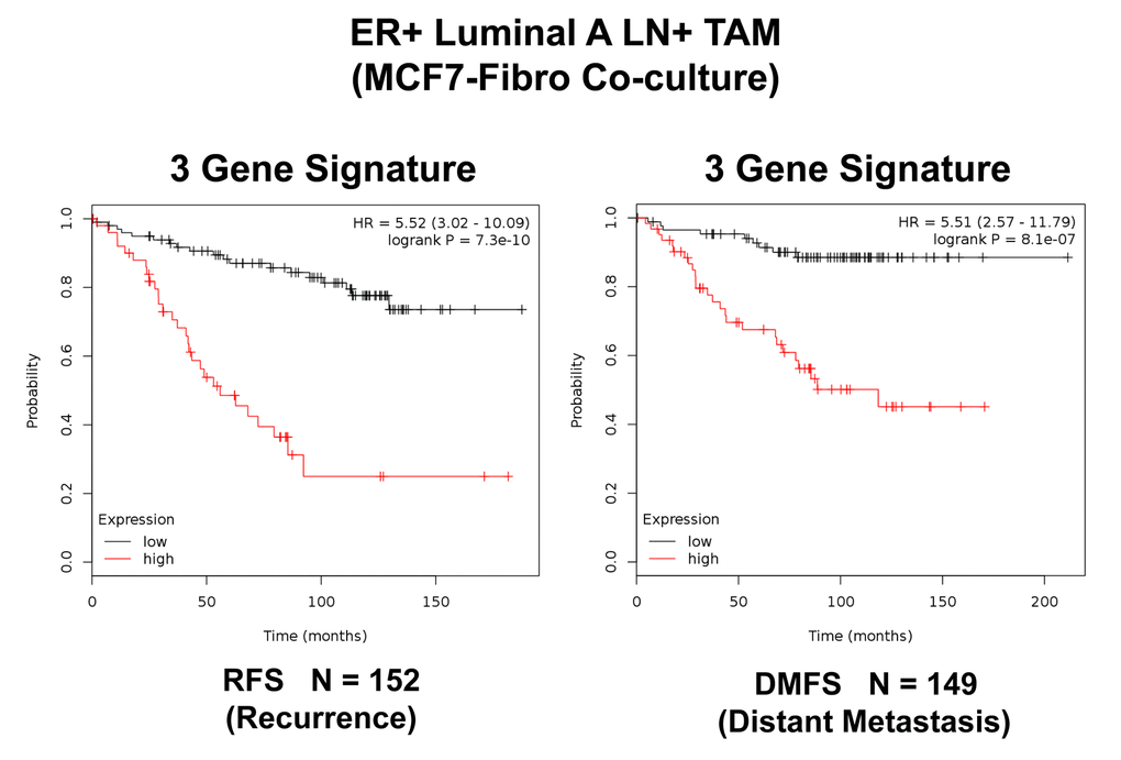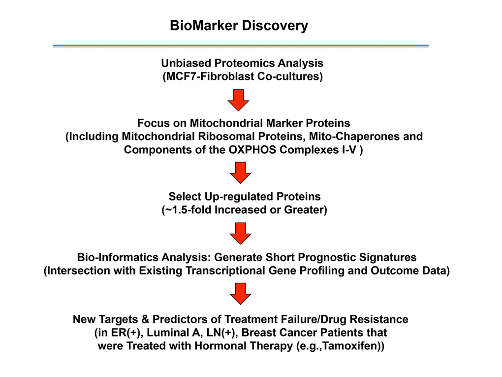 To assess whether these candidate biomarkers could be used as companion diagnostics for Tamoxifen- resistance, we used the targets identified by proteomics to construct a mitochondrial gene signature. Then, using publically-available clinical outcome data, we stringently evaluated the prognostic value of this Mito- Signature, which effectively predicted tumor recurrence and distant metastasis in breast cancer patients that were treated with Tamoxifen or hormonal therapy. The development of recurrence or metastasis during Tamoxifen treatment is a clear sign of treatment failure and is an accepted clinical hallmark of Tamoxifen- resistance.