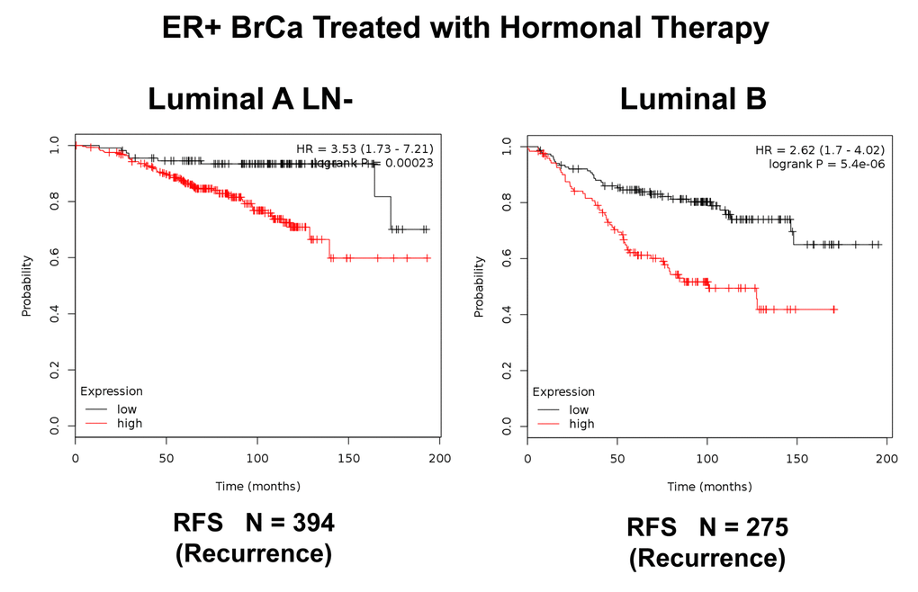 Importantly, this Mito-Signature yielded a significantly improved hazard-ratio for tumor recurrence of 5.52 (p = 7.3e-10). It was also highly predictive for distant metastasis, in the same group of patients (HR = 5.51; p = 8.1e-07). (See Figures 6). Similar results were obtained in Luminal A LN-negative patients and Luminal B patients (Figure 7).