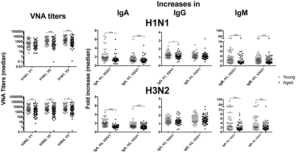 We tested antibody responses to influenza A viruses present in the annual TIV vaccines in 43 younger individuals between 30 to 40 years of age (median age: 33) and 65 elderly persons between the ages of 65 to 89 (median age: 77) before and after their vaccination with TIV during fall of 2013 and 2015. Within the younger cohort 67% were female and 93% were Caucasians. Distributions in gender and race were similar in the elderly with 72% females and 92% Caucasians. In both cohorts, 95% of individuals reported previous influenza vaccinations; 40% of the younger and 48% of the aged had received the vaccines each year for the 5 years prior to 2013 or 2015. Blood was collected at visit (V) 1 just prior to vaccination, and on days 7 (V2) and 14 or 28 (V3) after vaccination. Sera were tested for virus neutralizing antibodies (VNAs) and IgA, IgG and IgM to the two influenza A viruses present in the vaccine. As expected and reported previously by us and others [1, 3], antibody titers to H1N1 and H3N2 at baseline as well as increases in titers following vaccination but for H3N2-specific IgG were lower in elderly than younger individuals (Figure 1).