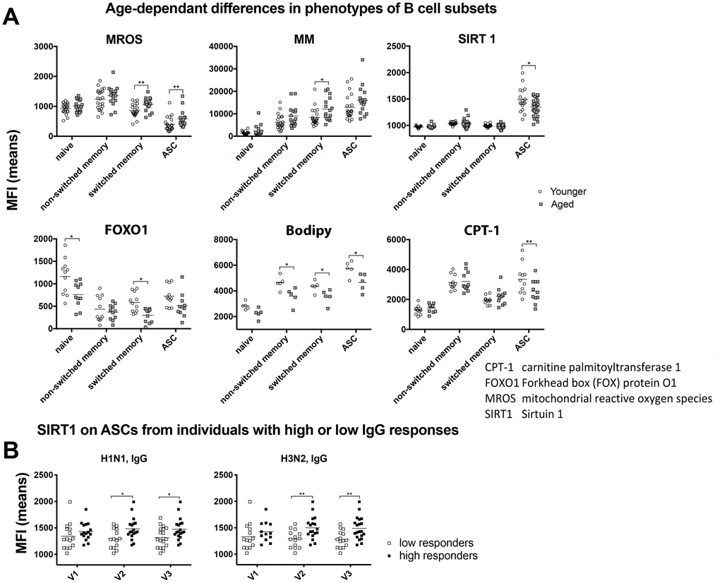 To assess if differential expression levels of metabolic markers in ASCs was linked to influenza virus-specific antibody responses, we compared expression in individuals with the lowest and highest antibody responses regardless of age. As shown in Figure 2B significant differences were observed for SIRT1, which was significantly higher in ASCs from individuals that developed more potent IgG responses to H1N1 and H3N2.