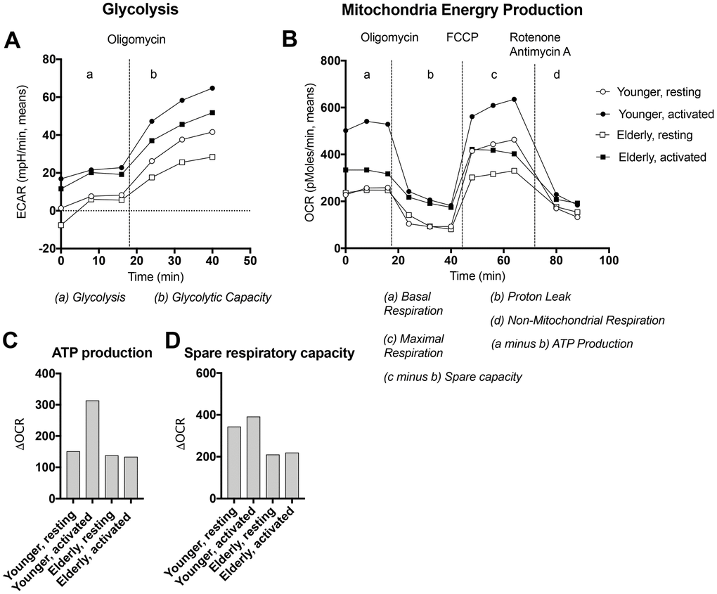 Overall these results indicate mild deficiencies in glycolysis in the aged with a reduced glycolytic capacity and more pronounced defects in mitochondrial energy production.