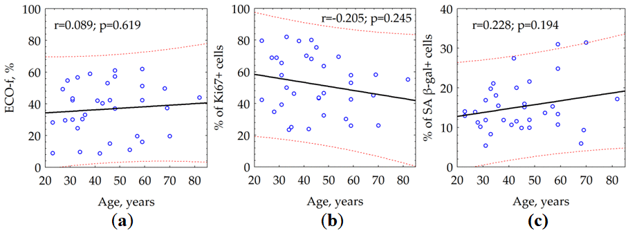 According to our data, neither the PP nor colony forming effectiveness (ECO-f) of the fibroblasts did not demonstrate a statistically significant difference between the groups of different age (Table 1).