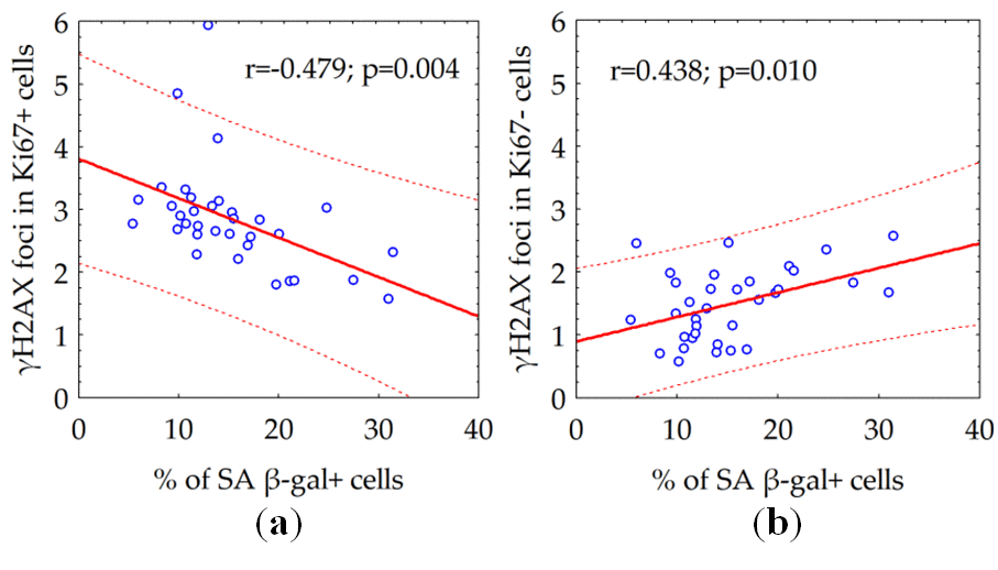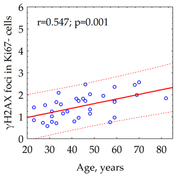 We observed a statistically significant (p = 0.001) correlation between the age of the donor and the number of the γH2AX foci in quiescent cells (Fig. 2). Notably, we could not reveal the relationship between the age of the donor and the average number of γH2AX foci (data not shown) within both total cell population (r = -0.095, p = 0.593) and fraction of proliferating (Ki67 +) cells (r = -0.241, p = 0.169).