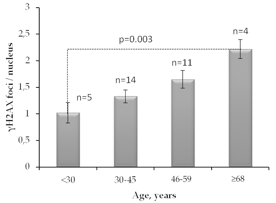 The average number of γH2AX foci in quiescent fibroblasts of 68-year- and older donors was about two times as higher as the one in the cells of up to 30-year-old donors (Fig. 3)