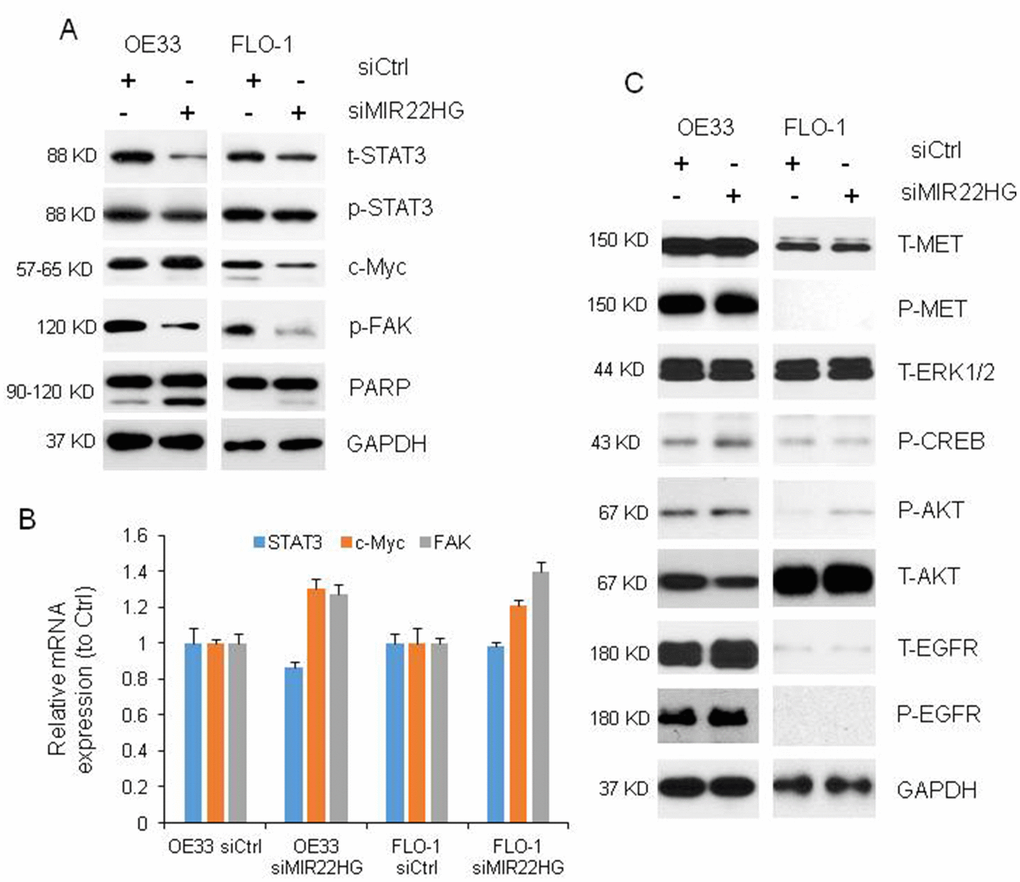 To understand the mechanisms of MIR22HG roles in regulating EAC cell proliferation in OE33 and FLO-1 cells, we performed western blot and found that knockdown of MIR22HG resulted in reduced total and phosphor STAT3 (t-STAT3 and p-STAT3) as well as phosphor FAK (p-FAK) proteins expression in OE33 and FLO-1 cell lines, while c-Myc protein was decreased in FLO-1 cells but unchanged in OE33 cells (Figure 3A). The mRNA levels of STAT3, c-MYC and FAK were not decreased after MIR22HG knockdown (Figure 3B) indicating that MIR22HG affected STAT3, c-Myc and p-FAK proteins may be at the post-transcriptional level. We did not find that MET, EGFR, AKT and ERK1/2 proteins were changed after MIR22HG siRNA treatment at 72 hours (Figure 3C), indicating that MET and EGFR signaling were not involved in MIR22HG regulation in EAC.