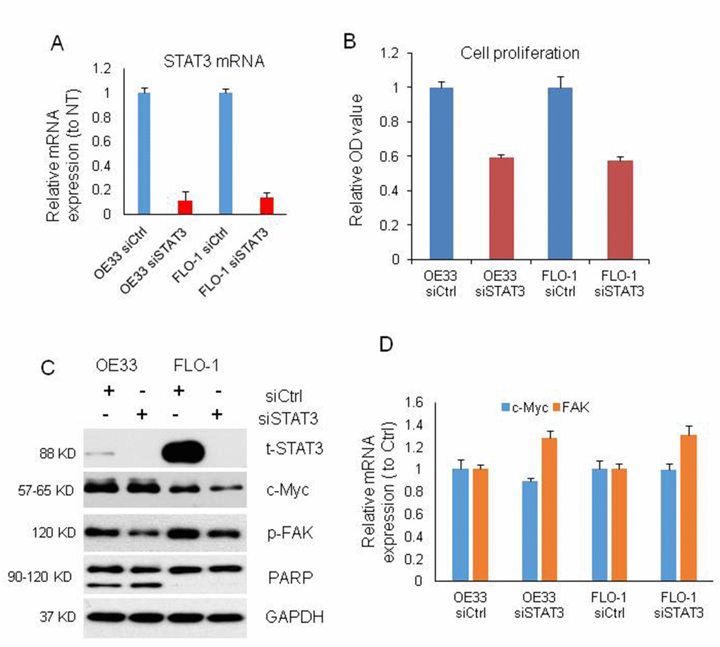 To further make clear the relationship among MIR22HG, STAT3, c-Myc and p-FAK proteins and roles in EAC proliferation and apoptosis, we performed knockdown of STAT3 with siRNA in OE33 and FLO-1 cells (Figure 4A). The cell proliferation was decreased by 40% upon STAT3 knockdown in OE33 and FLO-1 cells at 120 h (Figure 4B) and apoptosis was induced in OE33 (Figure 4C). We found that p-FAK protein was decreased in OE33 and FLO1 cells, while c-Myc was decreased in FLO-1 cells and unchanged in OE33 cells (Figure 4C), which was similar as MIR22HG knockdown in EAC cell lines (Figure 3A). While the mRNAs of c-Myc and FAK were not changed (Figure 4D). These results suggest that MIR22HG mediated control of EAC cell proliferation and apoptosis may occur via the STAT3/c-Myc/p-FAK axis (Figure 5).