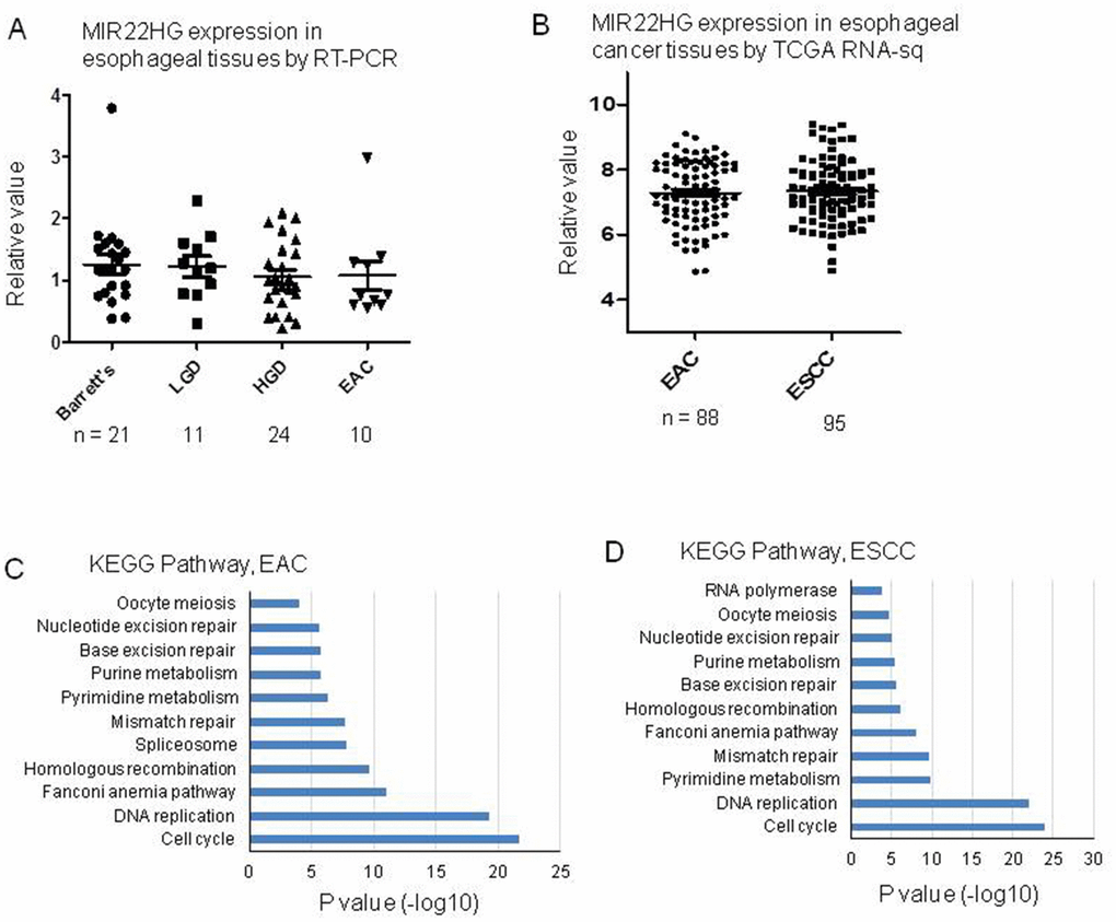 To explore the expression status of MIR22HG in primary EAC tumors, we first performed RT-PCR for MIR22HG expression from University of Michigan samples including EAC, high grade dysplasia (LDH), low grade dysplasia (LDH) and Barrett’s. There was no significant different among these groups (Figure 6A). We then analyzed MIR22HG expression from TCGA RNA-seq data including 88 EAC and 95 esophageal squamous cell carcinomas (ESCC). There was no significantly finding regarding patient survival, stage and EAC vs. ESCC (Figure 6B). We also performed DAVID Gene Ontology/pathway analysis of MIR22HG correlated (Pearson correlation) genes based on TCGA data, we found that the cell cycle and DNA replication pathways were the most significantly involved pathways in both EAC and ESCC (Figure 6C, 6D).