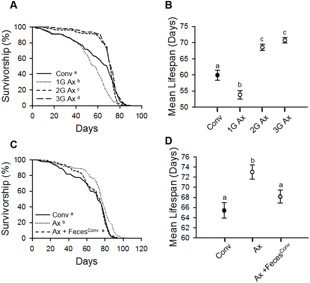 To clarify the effect of an absence of commensal microbes on host lifespan, we generated axenic (Ax) flies of laboratory wild-type strain w1118 D. melanogaster by using a sodium hypochlorite-based bleaching method as previously reported [15]. The mean lifespan of the first generation (1G) Ax flies hatched from bleached eggs was shorter than that of conventionally reared (Conv) flies (Figure 1A and 1B, Conv fly 59.92 ± 1.52 days; 1G Ax fly 53.83 ± 1.31 days, 10.16% decrease, log-rank test, χ2 = 38.85, p < 0.0001, Wilcoxon test, χ2 = 20.81, p < 0.0001). Because the bleaching process might have a deleterious effect on the health of flies, we measured the lifespan of second- (2G) and third- (3G) generation flies after first-generation bleaching. Interestingly, the 2G and 3G Ax flies had increased lifespans compared to that of Conv flies (Figure 1A and 1B, Supplementary Table 1; 2G Ax fly 68.52 ± 0.94 days, 14.35% increase, log-rank test, χ2 = 0.08, p = 0.77, Wilcoxon test, χ2 = 8.91, p < 0.005; 3G Ax fly 70.73 ± 0.85 days, 18.04% increase, log-rank test, χ2 = 8.20, p < 0.005, Wilcoxon test, χ2 = 18.93, p < 0.0001), suggesting that the bleaching method may have a detrimental effect on D. melanogaster, but the effect diminished over subsequent generations. To confirm whether the lifespan extension by egg bleaching is due to the absence of commensal microbes, we introduced microbes from 10-day-old Conv flies to 3-day-old 3G Ax flies by using fecal transplantation. As expected, the longevity effect of bacterial removal in Ax flies was diminished by fecal microbe transplantation (Figure 1C and 1D, Supplementary Table 1; Ax 73.00 ± 1.40 days; Ax + FecesConv 68.15 ± 1.30 days, 6.64% crease, log-rank test, χ2 = 22.61, p < 0.0001). These results indicate that the bleaching of eggs can have an adverse effect on adult fly lifespan, but the elimination of commensal microbes increases the lifespan of subsequent generations of flies.