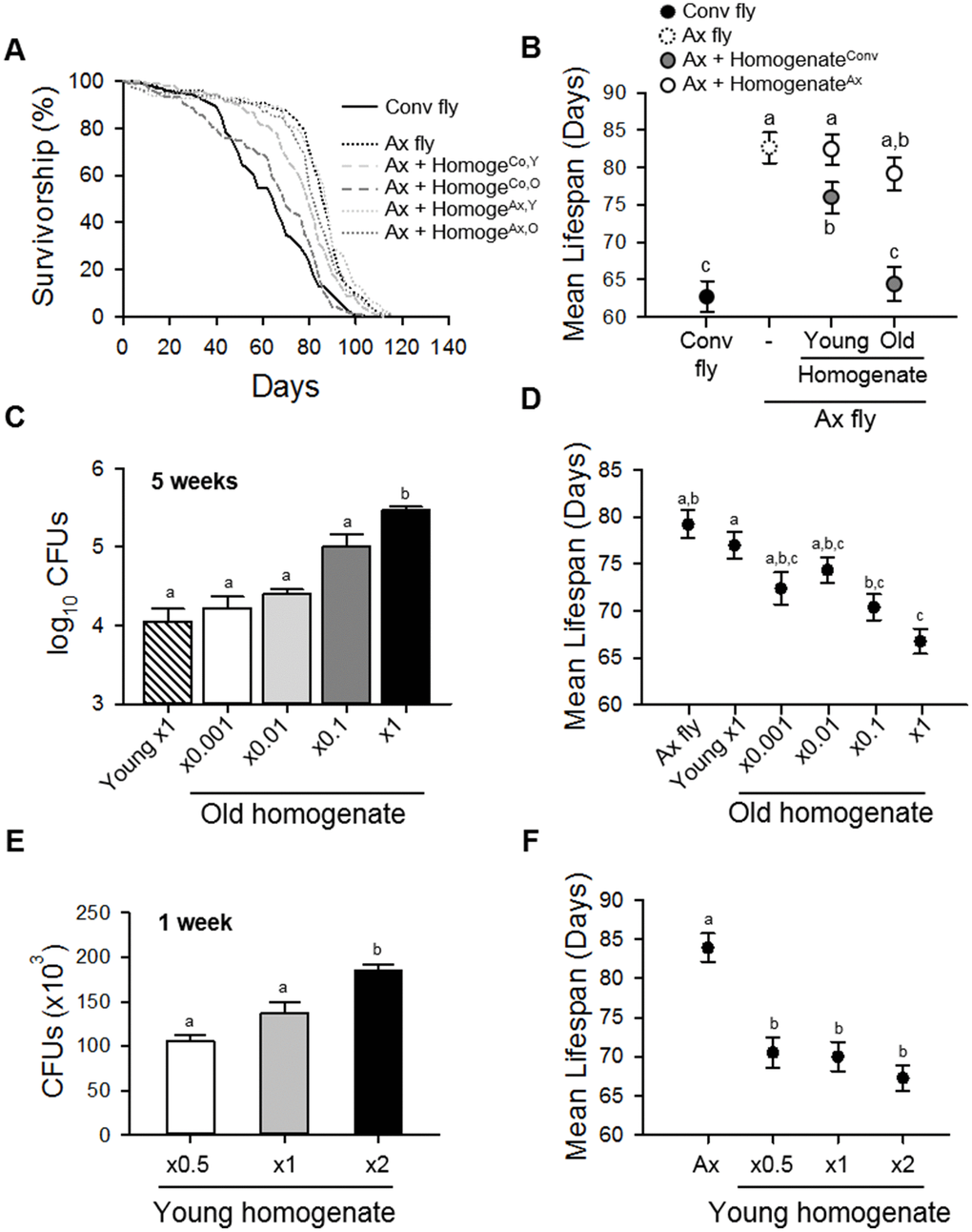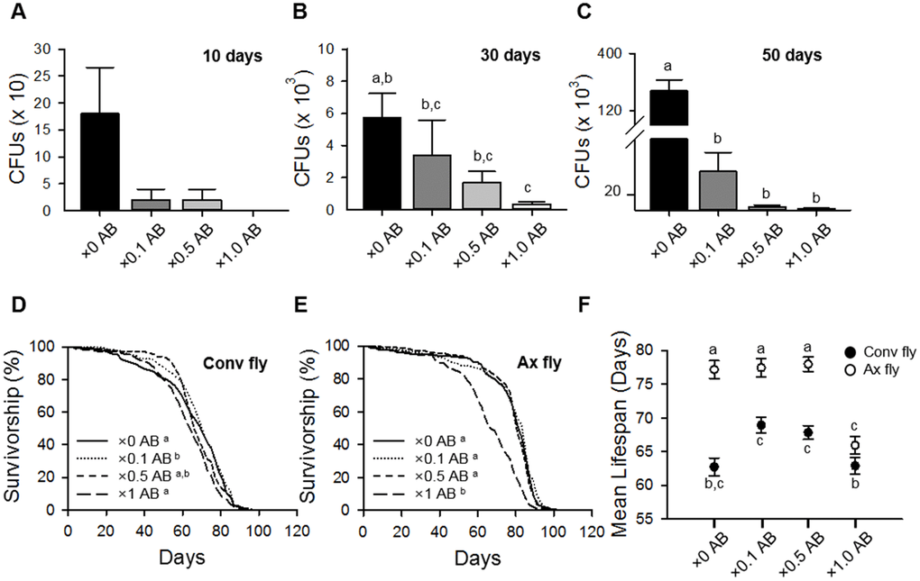 Taken together, the results showed that the elimination of commensal bacteria using a method that is not accompanied by detrimental side effects can increase the lifespan of flies. In addition, strains colonized with a high level of commensal bacteria exhibit a greater increase in lifespan following bacteria elimination.