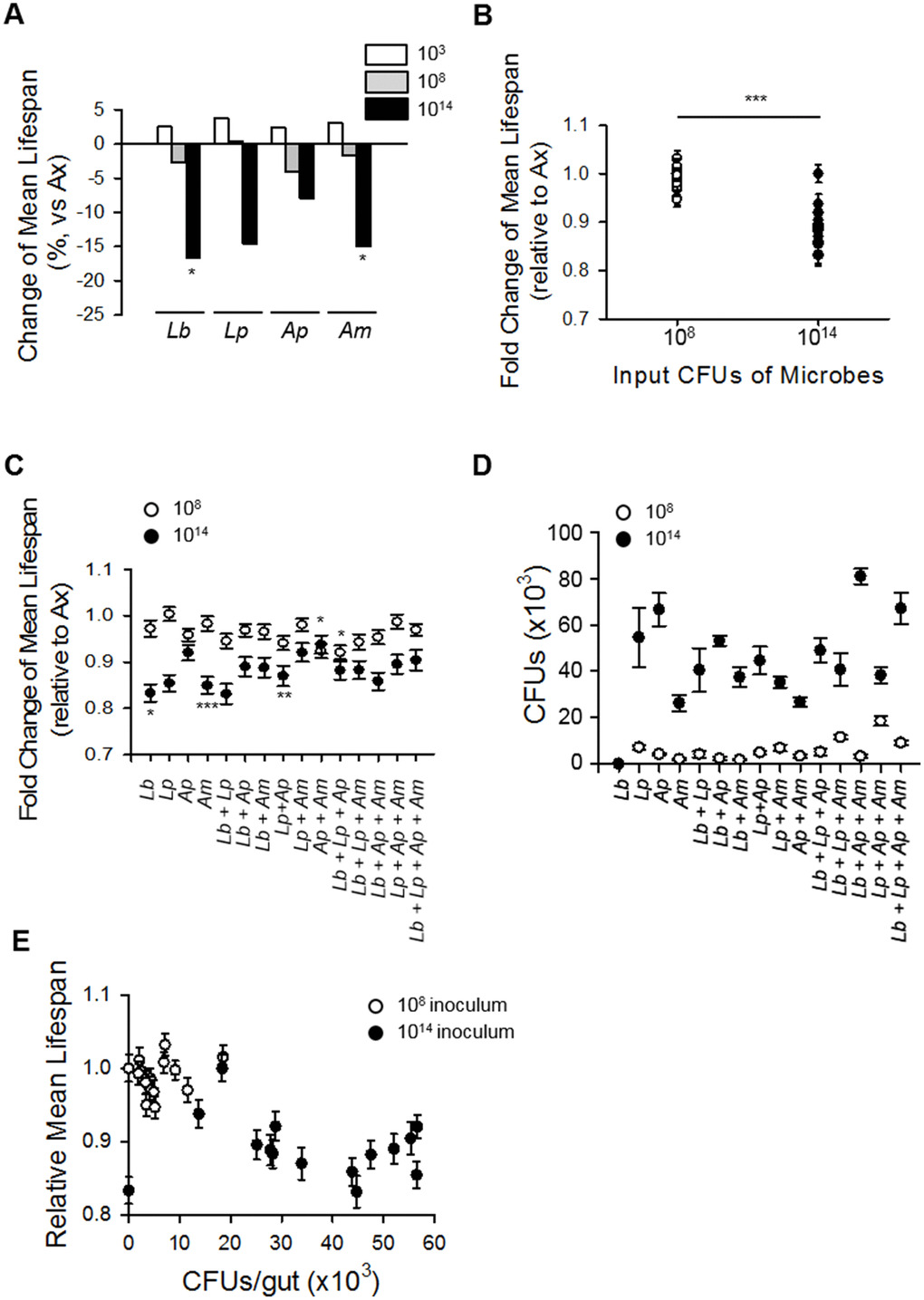 Our study was the first to undertake a comparative analysis of the relative effects of microbiota load and microbiota composition on Drosophila lifespan. Our results show that microbiota load has a greater influence than microbiota composition on the lifespan of Drosophila; however, we cannot exclude the possibility that a specific bacterial species proliferates faster than others which could affect the lifespan of axenic flies. In addition, we cannot exclude the possibility that other factors can also affect the host’s lifespan, including microbial diversity and species specificity. There are several reports showing age-related increases in bacterial load and its deleterious effect on health, and there have been trials investigating the modulation of organismal health and lifespan by specific microbes. For example, Bifidobacterium animalis lactis has promoted longevity and reduced tumor incidence in mice [33], and Lactobacillus salivarius isolated from a centenarian's fecal samples extended the lifespan of C. elegans [34]. In addition, many bacteria have been shown to have species- or strain-specific effects on host health. L. plantarum was shown to affect systemic larval growth in Drosophila in a strain-specific manner [3]. Moreover, L. plantarum induces dNox dependent cellular ROS production, but that effect was not observed with other members of the microbiota [35]. In addition, L. brevis and G. morbifer can induce chronic DUOX activation via uracil production, while other commensal microbes cannot [36]. Consistent with those observations, our results showed that colonization of the most dominant microbes combinations at 108 CFUs did not have a significant effect on lifespan, but inoculation of Ap+Am or Lb+Lp+Ap decreased lifespan (Figure 5C, Supplementary Figure 5, Supplementary Table 5–7, ANOVA, p < 0.0005; Tukey's HSD vs. Ax, Ax 85.59 ± 0.97 days; Ap+Am 79.08 ± 1.31 days, 7.61% decrease, p < 0.05; Lb+Lp+Ap 78.80 ± 1.28 days, 7.93% decrease, p < 0.05), even though the final concentrations of the inocula were equal (Figure 5D, Supplementary Table 10, Tukey's HSD vs. each group, p > 0.05). Moreover, although the bacteria decreased lifespan in all species combinations at high concentration (1014 CFUs), the extent of the decrease was different with the different microbe combinations (Figure 5C, Supplementary Table 5, Supplementary Tables 8, 9, ANOVA, p < 0.0005; Ax 76.68 ± 1.58 days; Lb 63.89 ± 1.42 days, 16.80% decrease, Tukey’s HSD test, p < 0.05; Am 65.17 ± 1.42 days, 15.01% decrease, Tukey’s HSD test, p < 0.005; Lp+Ap 66.72 ± 1.70 days, 12.99% decrease, Tukey’s HSD test, p < 0.005), indicating that there may be species-, strain-, or combination-specificity involved in the microbiota effects on lifespan regulation.