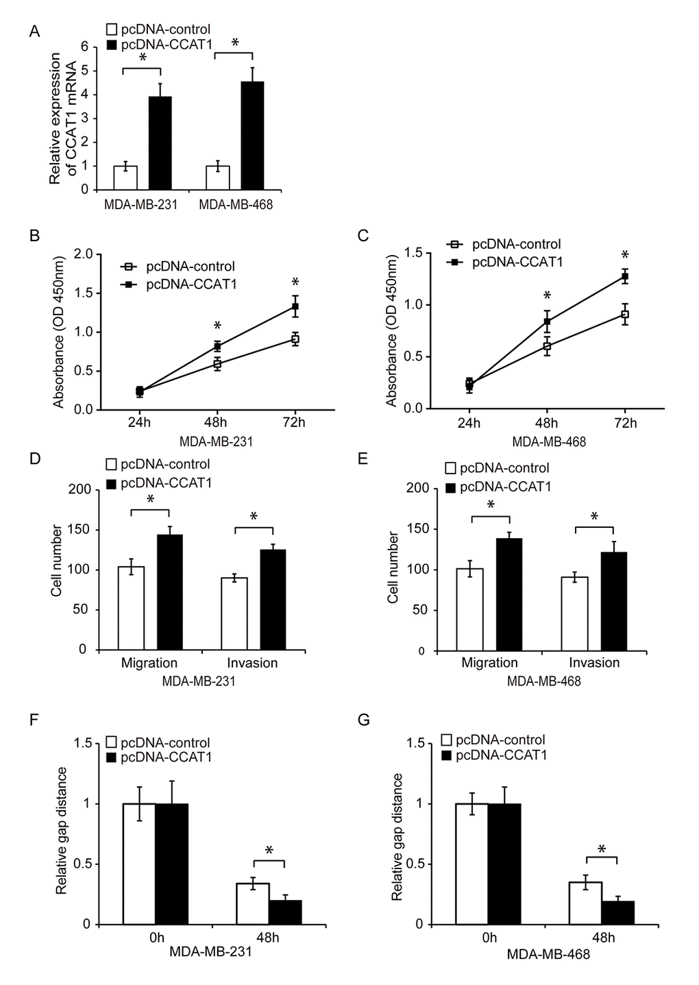 We next investigated whether CCAT1 could contribute to TNBC progression. CCAT1 was knocked down in MDA-MB-231 and MDA-MB-468 cells using siRNA. Downregulation of CCAT1 expression in both cell lines was confirmed using qRT-PCR (Figure 1C, P < 0.05). The effects of CCAT1 on cell proliferation were analyzed 24, 48, and 72 hours after siRNA transfection using CCK8 assays. CCAT1 knockdown resulted in reduced proliferation of TNBC cells compared to controls (Figure 1D and 1E, P < 0.05). We then analyzed whether CCAT1 was important for TNBC cell migration and invasion. Transwell and wound healing assays demonstrated that CCAT1 knockdown reduced cell invasion and migration in TNBC cells compared to controls (Figure 1F–1I, P < 0.05). We transfected TNBC cells with either a plasmid expressing CCAT1 (pcDNA-CCAT1) or empty vector control (pcDNA-control) and analyzed the effects of CCAT1 overexpression on cell proliferation using CCK8 assays. The transfection efficiency was confirmed by qRT-PCR (Figure 2A, P < 0.05). Overexpression of CCAT1 enhanced TNBC proliferation (Figure 2B and 2C, P < 0.05). Additionally, transwell and wound healing assays demonstrated that overexpression of CCAT1 promoted TNBC cell invasion and migration (Figure 2D–2G, P < 0.05). These findings indicated that CCAT1 promoted key steps in TNBC progression in vitro.