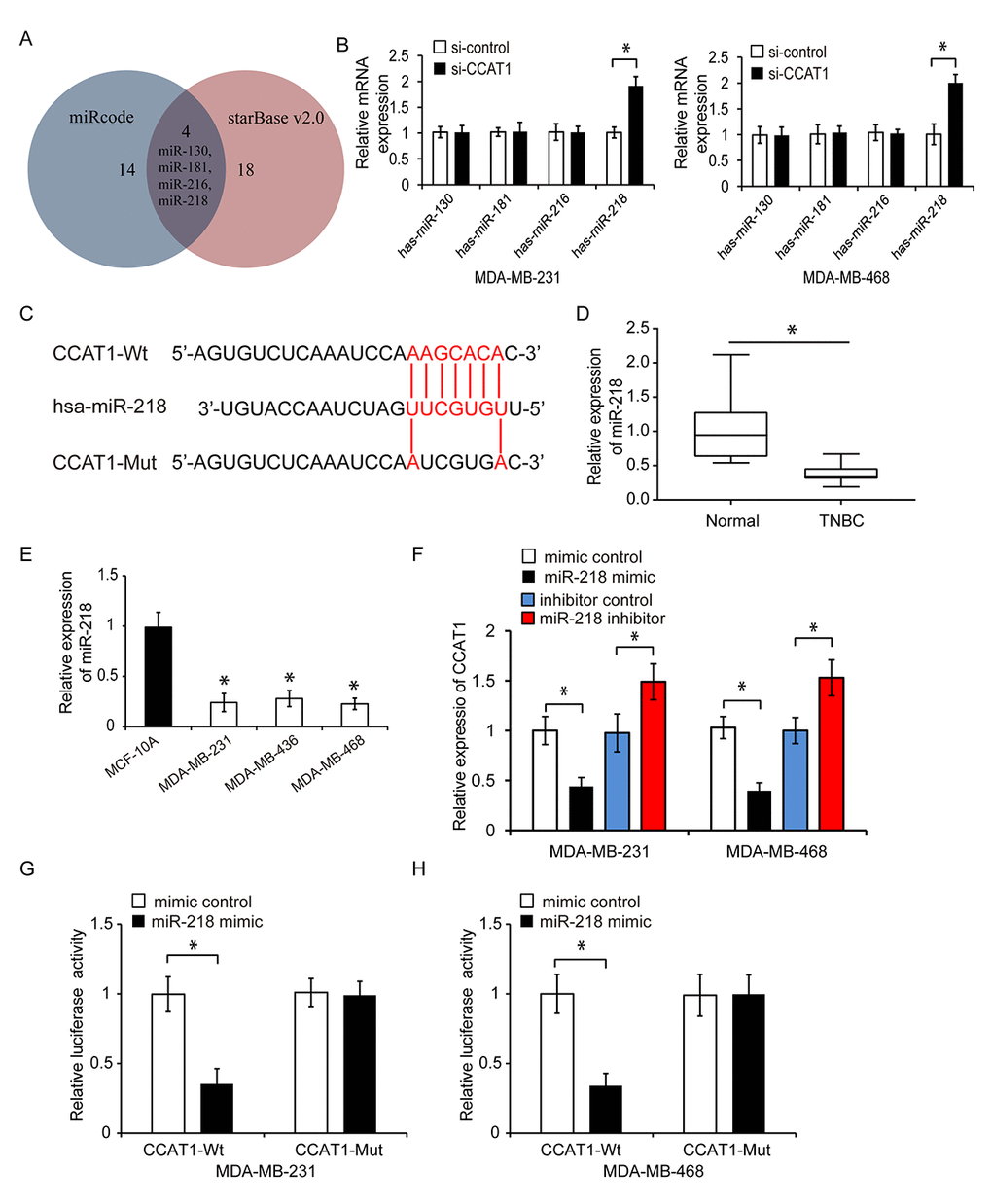 We next investigated the mechanisms underlying the effects of CCAT1 on TNBC cell proliferation, migration, and invasion. We performed bioinformatics analysis using miRcode and starBase 2.0 to identify potential miRNA targets of CCAT1 (Figure 3A). This analysis revealed four miRNAs (miR-130, miR-181, miR-216, and miR-218) that were potential targets of CCAT1. We transfected MDA-MB-231 and MDA-MB-468 cells with CCAT1 siRNA and found that only miR-218 expression was increased in response to CCAT1 knockdown (Figure 3B, P < 0.05). Therefore, we hypothesized that CCAT1 could function by targeting miR-218 in TNBC (Figure 3C). We evaluated miR-218 expression in human TNBC cell lines using qRT-PCR. MiR-218 was downregulated in all TNBC cell lines and tumor tissue analyzed (Figure 3D and 3E, P < 0.05). Overexpression of miR-218 resulted in a reduction in CCAT1 expression while knockdown of miR-218 resulted in an increase in CCAT1 expression in MDA-MB-231 and MDA-MB-468 cells (Figure 3F, P < 0.05). We constructed a luciferase reporter containing either wild-type CCAT1 (CCAT1-Wt) or a mutant version of CCAT1 (CCAT1-Mut) in which the binding sites for miR-218 were mutated. Overexpression of miR-218 inhibited luciferase activity in MDA-MB-231 and MDA-MB-468 cells transfected with CCAT1-Wt but not in cells transfected with CCAT1-Mut (Figure 3G and 3H, P < 0.05). These data suggested that CCAT1 could act as sponge for miR-218.