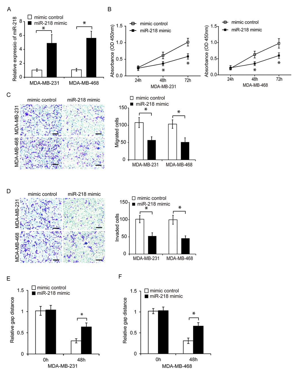 We next investigated the effects of miR-218 on TNBC cell proliferation. MiR-218 was overexpressed in MDA-MB-231 and MDA-MB-468 cells. Treatment of TNBC cells with a miR-218 mimic resulted in increased expression of endogenous miR-218 (Figure 4A, P < 0.05). CCK8 assays of cell proliferation revealed that overexpression of miR-218 reduced TNBC cell proliferation (Figure 4B, P < 0.05). We also evaluated the effects of miR-218 on cell invasion and migration using transwell and wound healing assays, respectively. Overexpression of miR-218 resulted in a decrease in TNBC cell invasion and migration compared to controls (Figure 4C–4F, P < 0.05). These data suggested that miR-218 has a tumor-suppressive role in TNBC.