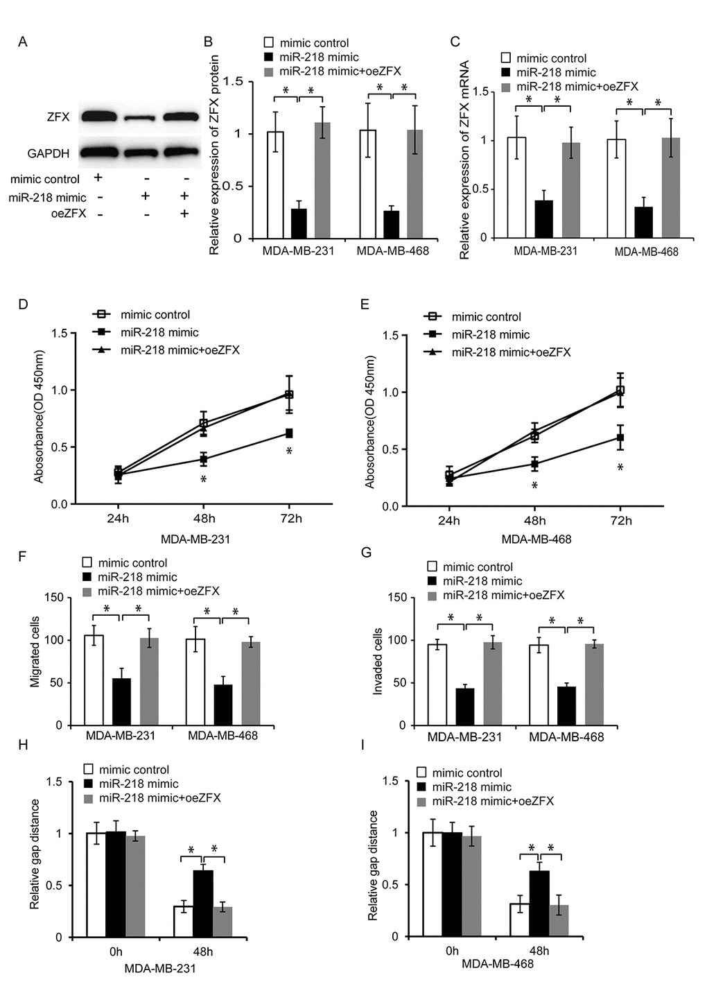 We next examined whether miR-218 negatively regulated ZFX to suppress TNBC cell proliferation, migration, and invasion. ZFX was overexpressed in TNBC cells transfected with a miR-218 mimic. The transfection efficiency in the control, miR-218 mimic, and miR-218 mimic plus pcDNA-ZFX (oeZFX) groups was evaluated by western blotting and qRT-PCR (Figure 7A–7C, P < 0.05). Cell proliferation, migration, and invasion were then analyzed using CCK8 assays, wound healing assays, and transwell assays, respectively. Overexpression of ZFX abolished the suppressive effects of miR-218 on TNBC cell proliferation, migration, and invasion, suggesting that miR-218 negatively regulates ZFX to inhibit TNBC progression (Figure 7D–7I, P < 0.05).