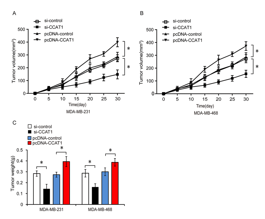 Because CCAT1 promoted TNBC cell proliferation, migration, and invasion in vitro, we investigated whether it could promote tumor growth in vivo. We subcutaneously injected nude mice with MDA-MB-231 and MDA-MB-468 cells that were stably transfected with a control siRNA (si-control), siRNA targeting CCAT1 (si-CCAT1), empty vector control (pcDNA-control), or vector expressing CCAT1 (pcDNA-CCAT1) and monitored the growth of the xenograft tumors (Figure 8A–8C, P < 0.05). Tumor weight and volume were lower in the si-CCAT1 compared to the si-control group. Tumor size and weight were higher in the pcDNA-CCAT1 compared to the pcDNA-control group. These results suggested that CCAT1 promotes TNBC progression in vivo.