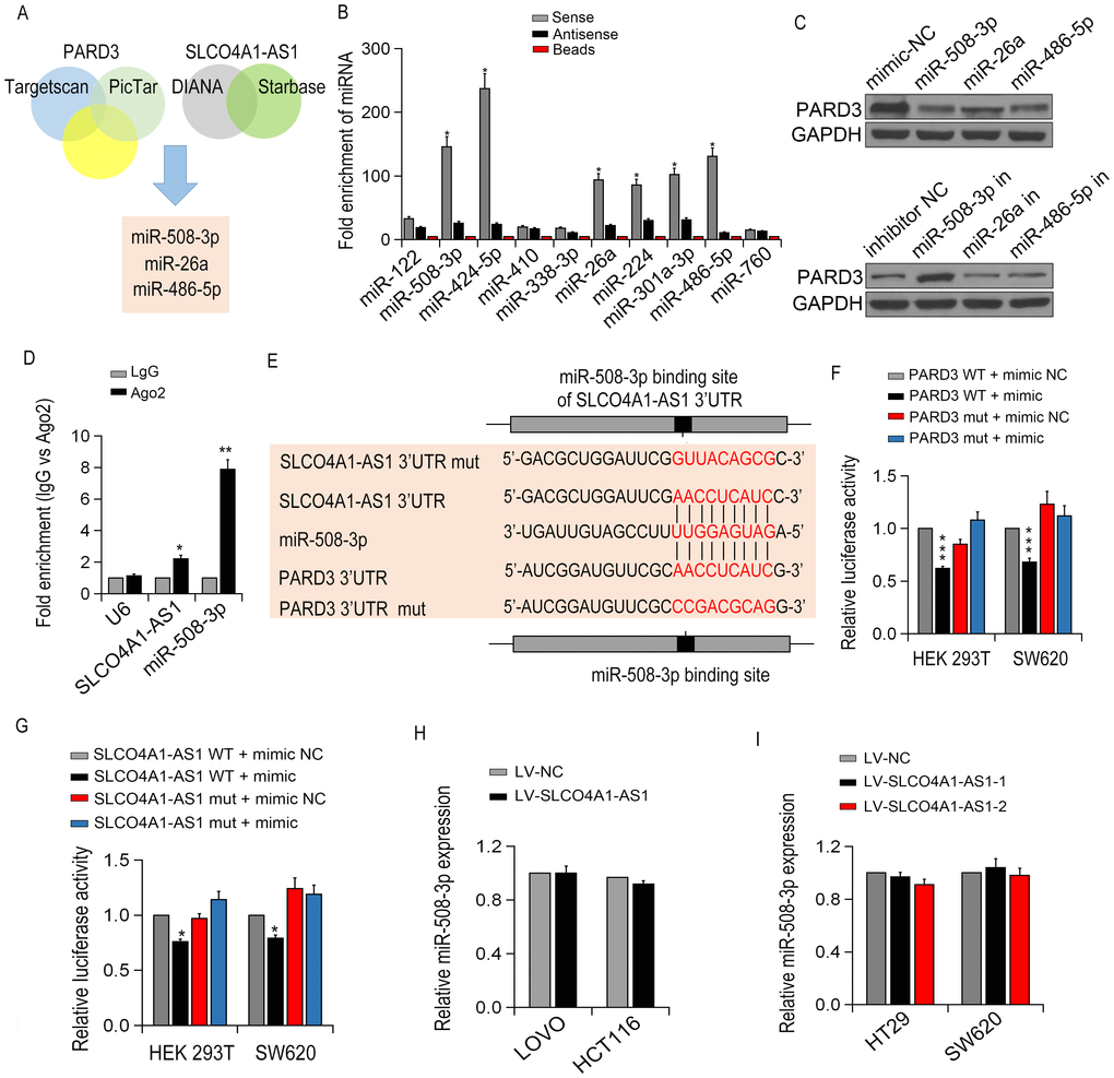 To determine whether SLCO4A1-AS1 serves as a ceRNA, we use online bioinformatics analysis (miRanda, PicTar and TargetScan) to predict the potential miRNA binding sites. Then, RNA pull-down tests determined the involved miRNAs interacted with SLCO4A1-AS1, and miR-508-3p, miR-26a and miR-486-5p were identified to interact with SLCO4A1-AS1 (Figure 7B). We then detected the expression of PARD3 in SW620 cells after up- or down-regulating miRNA expression. Interestingly, among these miRNAs, the expression of endogenous PARD3 was significantly down-regulated by miRNA-508-3p (Figure 7C). Besides, the specific interaction of SLCO4A1-AS1 and miR-508-3p in SW620 cells was confirmed by RIP assay (Figure 7D).