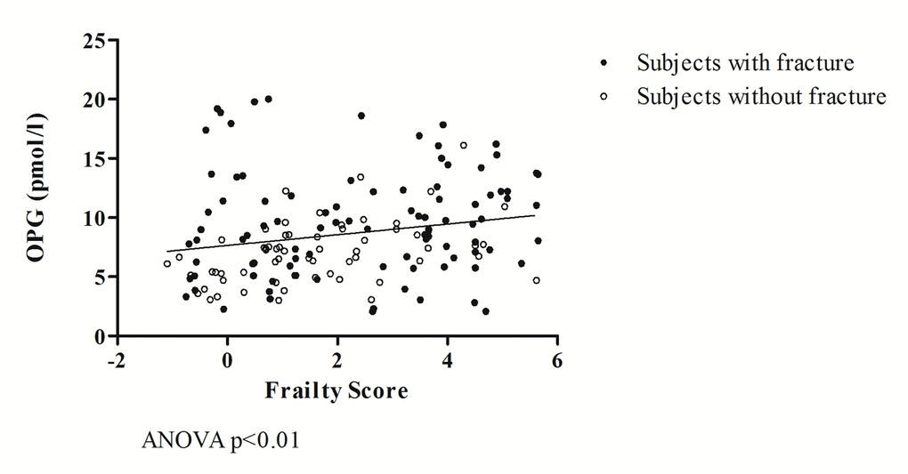 In a linear regression model (Figure 1) of the entire study population, OPG was directly and significantly correlated with the values of the Frailty Score (ANOVA r=0.208; p<0.01). OPG mean values were 9.59 ± 4.60 in subjects with hip fracture and 7.03 ± 2.58 in subjects without fractures (p<0.001).