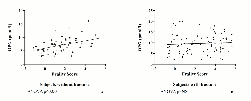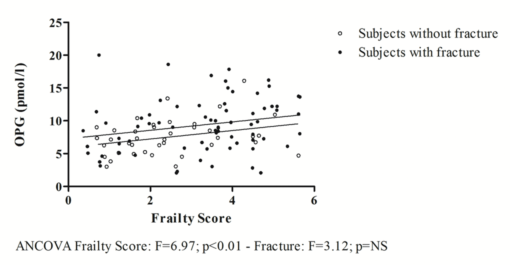 A covariance analysis (ANCOVA) shows how a fracture event influences, in a statistically significant manner, the regression between OPG and Frailty Score (F=14.40; p<0.001), which are closely associated with one another (F =4.32; p<0.05).