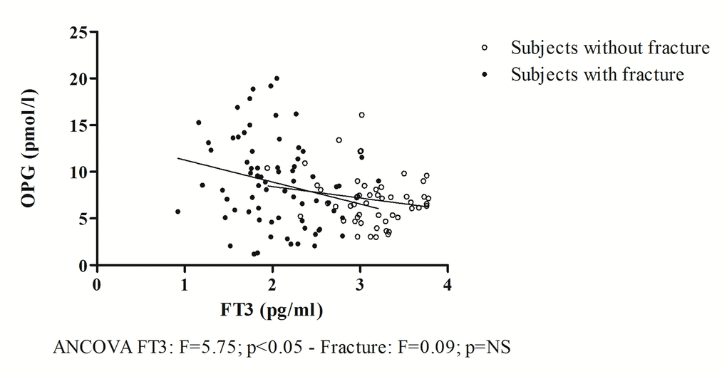 In the study population, Frailty Score values are inversely associated with FT3 values (ANCOVA F=10.02; p<0.005) regardless of fracture event (ANCOVA F=0.12; p=NS). Furthermore, as shown in Figure 4, FT3 values are inversely and significantly correlated with OPG values (ANCOVA F=5.75, p<0.05), regardless of the presence of fracture (ANCOVA F=0.09; p=NS).