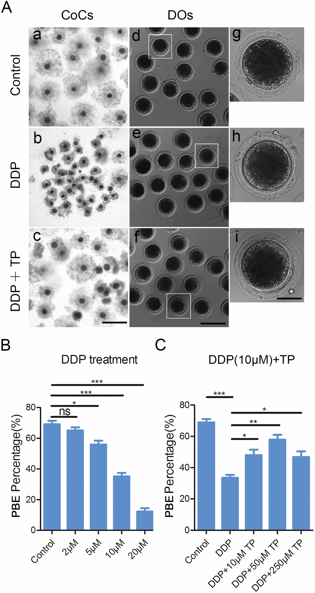 DDP was dissolved in DMF then in TCM-199 culture medium to a final concentration of 2,5,10 and 20 μM. TP was dissolved in PBS and diluted with maturation medium to a final concentration of 10 μM, 50 μM and 250 μM. It should be added to maturation medium immediately before use. The final concentrations of DMF in the culture medium were not more than 0. 1%.