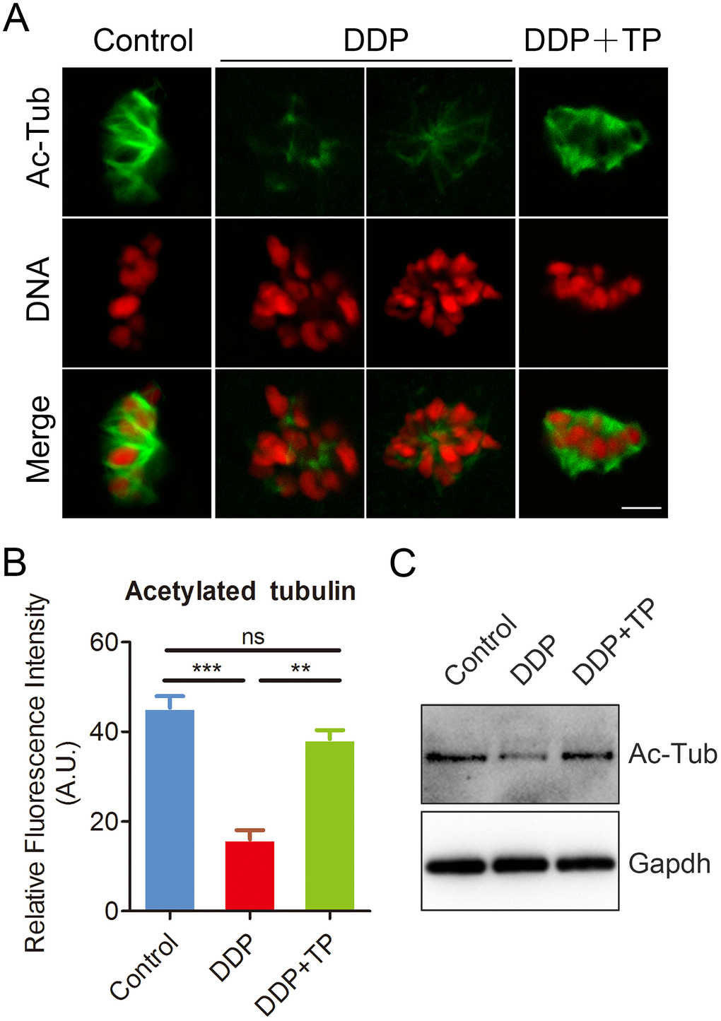 Studies have shown that the disorganized spindle structure might be resulted from the disruption of acetylation level of α-tubulin, an indicator of stable microtubules in oocytes [30–33]. Therefore, we next assessed the level of acetylated α-tubulin in oocytes exposed to DDP. Immunostaining analysis and quantitative measurement of the fluorescence intensity indicated that α-tubulin in DDP-exposed oocytes displayed an apparently decreased level of acetylation compared with the controls (16.0 ± 2.1, n=52 VS 45.4 ± 2.6, n=55, P < 0.001; Figure 3A, 3B). While TP supplementation remarkably raised the signals of acetylated α-tubulin in DDP-exposed oocytes (38.3 ± 2.0, n=57 VS 16.0 ± 2.1, n=52, P < 0.01). These observations were further confirmed by the immunoblotting analysis (Figure 3C), implying that the recovery of perturbed spindle structure in DDP-exposed oocytes by TP supplementation might be mediated by the maintenance of acetylation level of α-tubulin.
