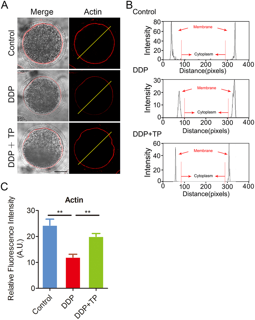 During oocyte meiotic maturation, the actin assembly plays a critical role in asymmetric spindle positioning and cortical polarization [34–36]. To investigate whether the meiotic defects induced by DDP exposure involves the actin dynamics, phalloidin-TRITC was employed to stain the F-actin to observe the polymerization of actin filaments. As shown in Figure 4A, actin filaments were concentrated uniformly on the plasma membrane with robust signals in control oocytes. By contrast, DDP-exposed oocytes displayed the impaired assembly of actin filaments with weak signals (Figure 4A), which was confirmed by the fluorescence plot profiling that was quantified along the lines drawn through the oocytes (Figure 4B). In addition, the quantitative measurement of fluorescence intensity on the membrane revealed that actin signals were substantially decreased in DDP-exposed oocytes, but increased to the control comparable level after supplementation with TP (control: 24.4 ± 2.2, n=47, P < 0.01; DDP: 12.3 ± 1.1, n=49; TP: 22.3 ± 1.2, n=53, P < 0.01; Figure 4C), indicating that TP prevents the assembly of actin cytoskeleton from damage induced by DDP exposure.