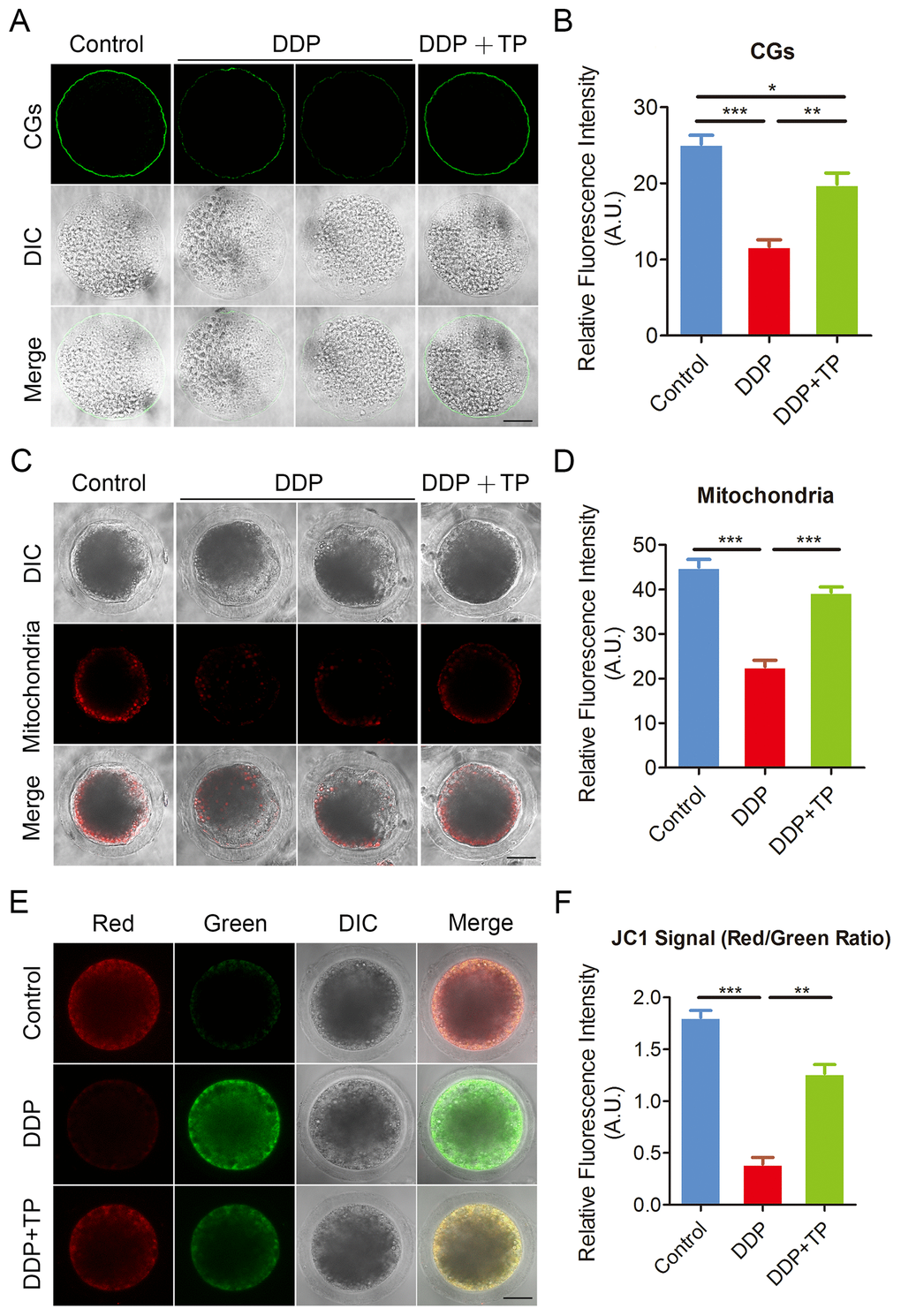The distribution of CGs (cortical granules) and mitochondria are two key indexes of cytoplasmic maturation of oocytes [37, 38]. CGs are triggered at fertilization to migrate to the plasma membrane of oocytes, where they fuse and exocytose their contents to prevent polyspermy [39]. The results from Figure 5A showed that the signals of CGs exhibited markedly faded following culture with DDP. The quantification analysis also confirmed that the fluorescence intensity of the signals had a significant decline in DDP-exposed oocytes compared to the controls (11.7 ± 0.9, n=52 VS 25.1 ± 1.2, n=51, P < 0.001; Figure 5B), and this decline was rescued by the supplementation of TP during in vitro culture (19.9 ± 1.5, n=47, P < 0.01; Figure 5B).
