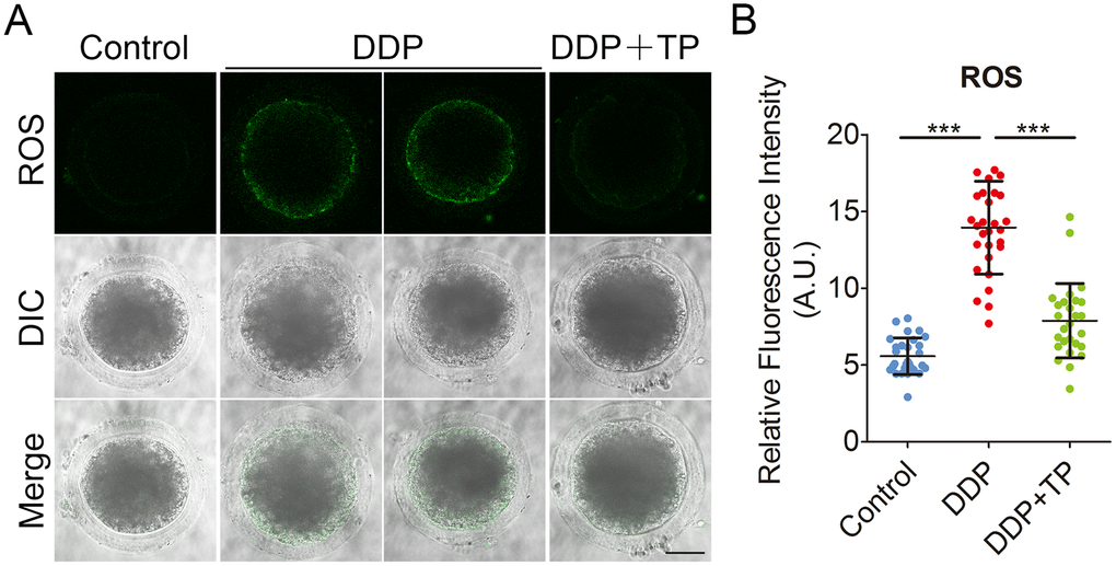 DDP is known to induce oxidative stress in various cells to impair the cellular functions [40, 41], we then tested if the defects observed in DDP-exposed porcine oocytes were mediated by this mechanism. To verify this assumption, we compared the ROS levels between control and DDP-exposed oocytes by DCFH staining. The results showed that in control oocytes the signals were hardly detected (Figure 6A). However, DDP exposure remarkably increased the green signals in the cytoplasm of oocytes (Figure 6A). Consistently, the fluorescent intensity of ROS was significantly increased in DDP-exposed oocytes compared to controls (14.0 ± 0.6, n=29 VS 5.6 ± 0.2, n=29, P < 0.001; Figure 6B). Supplementation with TP effectively reduced the levels of ROS in DDP-exposed oocytes (7.9 ± 0.5, n=27, P < 0.001; Figure 6A, 6B).