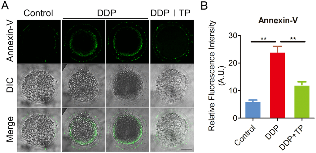 Since the excessive oxidative stress always induces DNA damage and apoptosis [42, 43], we next assessed DNA damage and the early apoptosis in oocytes by γ-H2A.X and Annexin-V staining. The immunofluorescence results showed that the foci of γ-H2A.X were accumulated on the DNA in DDP-exposed oocytes instead of control oocytes, in agreement with the quantification data showing that the intensity of γ-H2A.X signals was remarkably elevated in DDP-exposed oocytes in comparison with the controls (26.4 ± 1.1, n=33 VS 10.1 ± 0.4, n=32, P < 0.001; Figure 7A, 7B). While treatment with TP markedly decreased the occurrence of DNA damage (15.2 ± 0.8, n=31, P < 0.001; Figure7A, 7B). Also, we observed that the fluorescent signals of Annexin-V were rarely present in control oocytes, but clearly found on the plasma membrane of DDP-exposed oocytes (Figure 8A). Concordantly, the rate of apoptotic oocytes was dramatically higher in DDP-exposed group than that in controls (24.0 ± 2.0, n=36 VS 6.5 ± 0.7, n=38, P < 0.01; Figure 8A, 8B), but rescued in TP -supplemented group (11.8 ± 0.9, n=41; P < 0.01; Figure 8A, 8B).