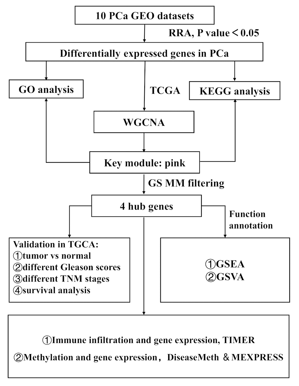 In the present study, 10 microarray datasets from Gene Expression Omnibus (GEO, http://www.ncbi.nlm.nih.gov/geo/) were analyzed with RRA to identify robust and stable differentially expressed genes (DEGs) between PCa tissues and matched controls [11]. These DEGs were then adopted to find key modules associated with clinical features through weighted gene co-expression network analysis (WGCNA). Gene Ontology (GO) and Kyoto Encyclopedia of Genes and Genomes (KEGG) analyses were further conducted to assess potential functions of the genes within the key module. Four seldomly reported hub genes, LMNB1, TK1, and RACGAP1, and ZWINT, were selected to validate their diagnostic and prognostic value for PCa. In addition, two online tools, DiseaseMeth 2.0 and MEXPRESS, were used to assess the methylation status of those four hub genes, while Tumor Immune Estimation Resource (TIMER), Gene Set Enrichment Analysis (GSEA), and Gene Set Variation Analysis (GSVA) were utilized to investigate potential biological functions.