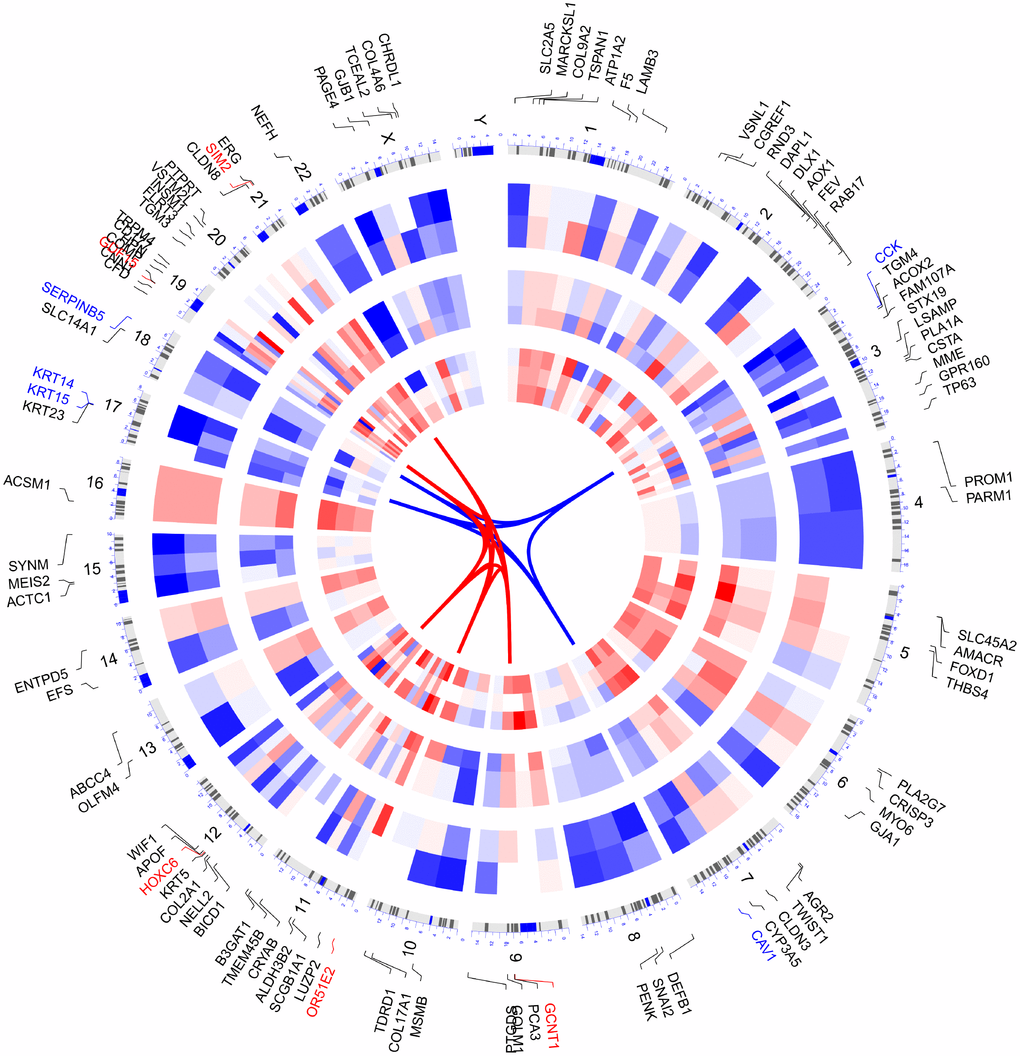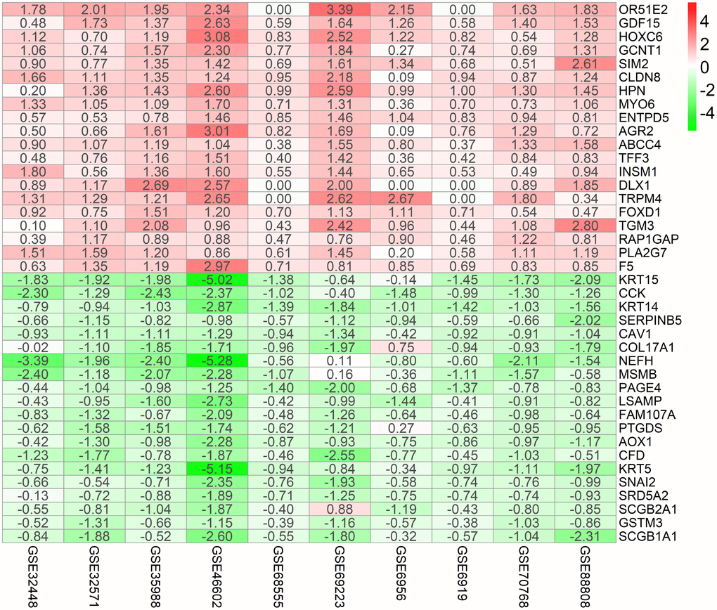 We selected the top 100 DEGs from RRA analysis to visualize their expression patterns across the 10 datasets included in this study, as well as their chromosomal locations (Figure 3). Chromosome 3 contained most DEGs. These DEGs were distributed in all chromosomes except for chromosome Y, which showed no alterations. The top 5 upregulated genes according to adjusted P, i.e. OR51E2, GDF15, HOXC6, GCNT1, SIM2, were distributed in chromosomes 11, 19, 12, 9, and 21. The top 5 downregulated genes (KRT15, CCK, KRT14, SERPINB5, and CAV1) were located in chromosomes 17, 3, 17, 18, and 7.
