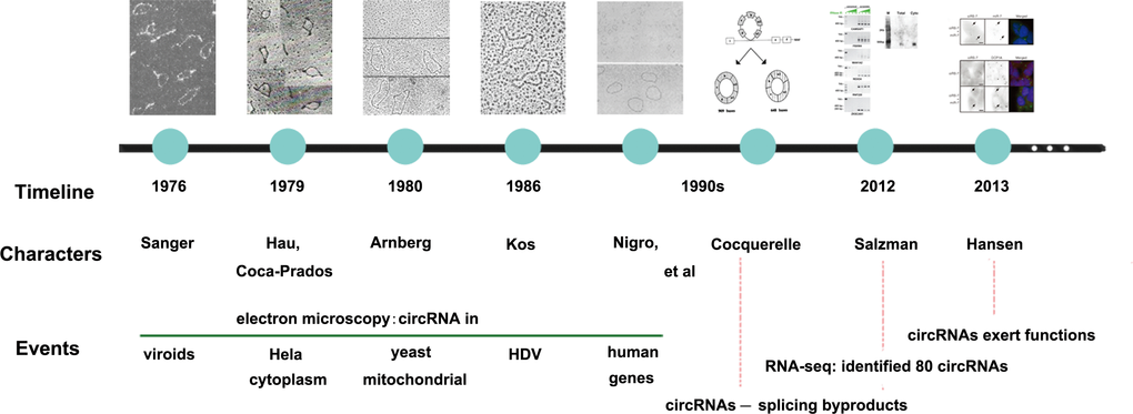 In 1976, since Sanger [1] discovered a closed circular single-stranded RNA molecule with covalent bonds in viroids through electron microscopy, the concept of circRNAs came into being for the first time. Three years later, Hsu and Coca-Prados [2] extracted RNA from Hela cytoplasm, and the electron microscopy revealed that 1-2% of them were circRNAs. They also suggested that the majority of circRNAs may localize in cytoplasm rather than in nucleus. In 1980, Arnberg [3] observed that about 50% of the yeast mitochondrial RNA which was separated by agarose gel electrophoresis from 11S and 18S fragments contained circular molecules and was also confirmed in saccharomyces cerevisiae by ten years [4]. In 1986, Kos [5] presented HDV contained a single-stranded circular RNA molecule. As early as 1990s, first endogenous circRNA with inverted order of exons was found in human DCC by Nigro [6], followed by human proto-oncogene ests-1 and mice Sry genes [7,8]. Before 2000s, circRNAs were regarded as either splicing byproducts or intermediates escaping lariat structures from debranching [8–10]. Not until 2012, along with the mushroom growth of high-throughput sequencing and microarray technology as well as the application of bioinformatics, circRNAs had begun to be recognized as large species of RNAs with thousands of members in mammalian cells. Salzman [11] first reported about 80 circRNAs based on RNA sequencing results. Subsequently, more than 25,000 circRNAs in human fibroblasts, 1,950 circRNAs in HEK293 cells, 1,903 circRNAs in mouse brain tissue and 724 circRNAs in nematodes were found [12]. Thus, circRNAs are thought to be important transcriptional products. Danan has found abundant circRNAs which might have certain biological functions [13]. Memczak [14] presented the opinion that coding sequences possessed previously unrecognized regulatory potential. In addition, Hansen’ s [15] study, the first functional analysis of a naturally expressed circRNA, together with above-mentioned study, has aroused researchers’ intense interest in circRNAs research. The main development trends of circRNAs were shown in Figure 1.
