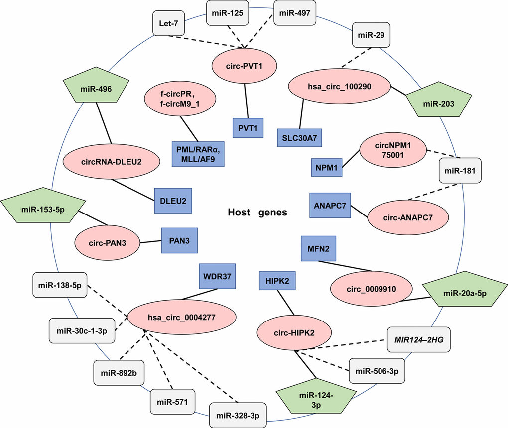 | AML | hsa_circ_0004277 | WDR37 | downregulated | BM | miR-138-5p, miR-30c-1-3p, miR-892b, miR-571, miR-328-3p/SH3GL2, PPARGC1A, PIP4K2C, SH2B3, ZNF275, and ATP1B4* | Associated with risk-status and treatment | A potential diagnostic biomarker | [62] | |||||||||||||||||||||||||||||||||||||||||||||||||||||||||||||||||||||||||||||||||||||||||||