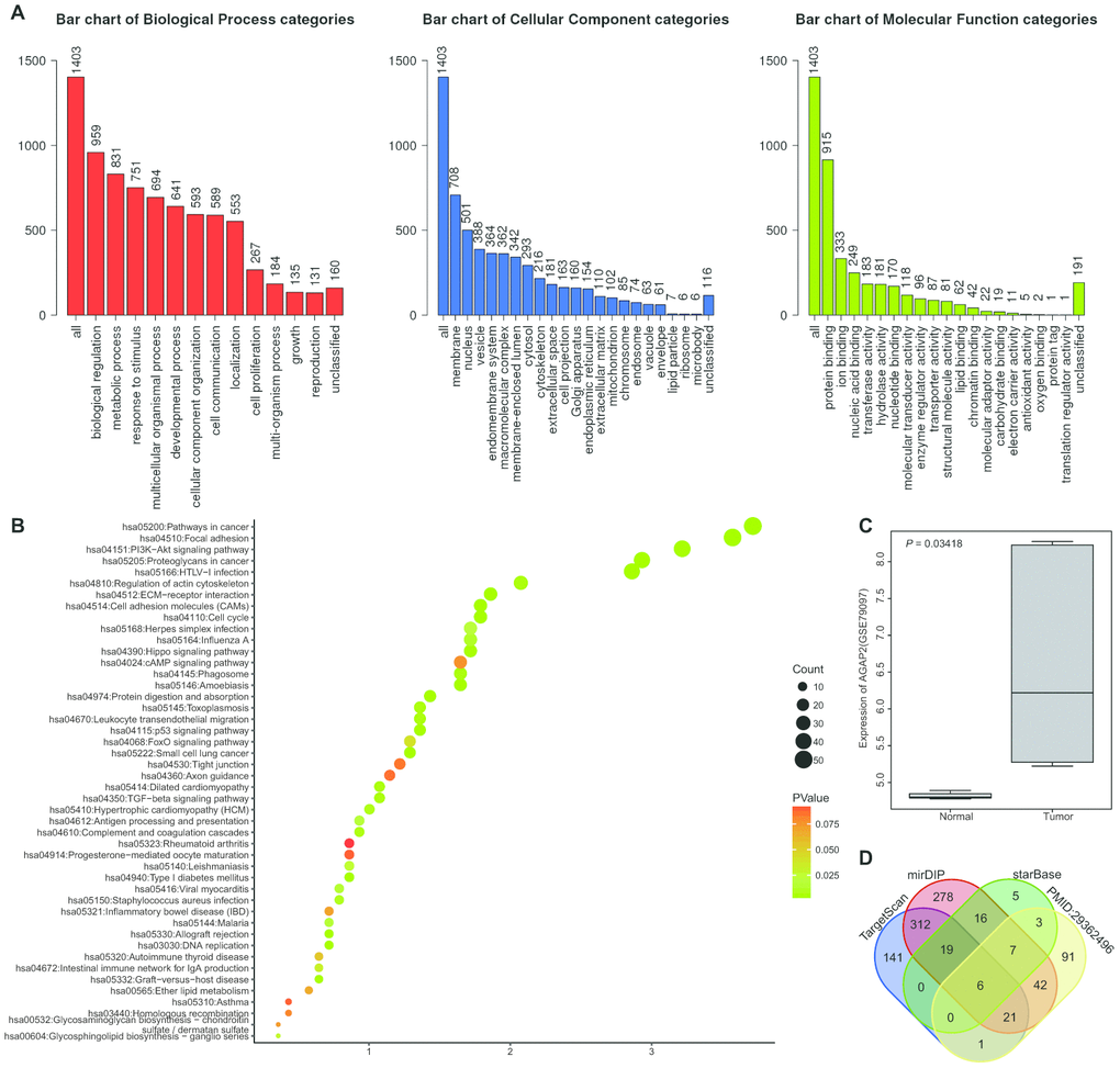 The glioma-related expression dataset of GSE79097 was retrieved from the GEO database. A large number of differentially expressed genes (DEGs) were obtained to analyze the gene expression differences between glioma samples and normal samples. GO functional enrichment analysis revealed the main enrichment of the DEGs in "biological regulation", "membrane" and "protein binding" items (Figure 1A). Further enrichment analysis of KEGG items revealed that these DEGs were mainly concentrated in the signaling pathways of "Pathways in cancer", "Focal adhesion" and "PI3K-Akt signaling pathway" (Figure 1B). These results indicate that the DEGs are likely to be implicated in glioma development. Among these DEGs, it was noted that AGAP2 was highly expressed in gliomas (Figure 1C). Current studies have revealed that AGAP2 is involved in multiple tumor disease regulation including gliomas [17–19]. In order to further understand the upstream regulation mechanism of AGAP2 gene in glioma, Target Scan and other databases were applied to predict the upstream regulatory miRNAs of AGAP2. Meanwhile, the miRNAs expressed in the exosomes of human mesenchymal stem cells (hMSCs) were retrieved in a previously published literature [20]. The predicted results of the databases were intersected with reported miRNAs in the literature (Figure 1D). Finally, six potential regulatory miRNAs of AGAP2 were obtained. Among the six miRNAs, we found that miR-199a was in highest abundance in the exosomes among the reported miRNAs. These results suggested that miR-199a is likely to target the AGAP2 gene in glioma via exosomes, which could ultimately prevent glioma development.