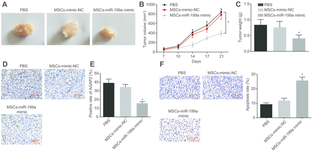 To further evaluate the carrier effect of hMSCs and whether miR-199a still had obvious anti-tumor effect in vivo, MSCs transfected with miR-199a mimic (MSCs-miR-199a mimic), MSCs transfected with mimic NC (MSCs-mimic-NC) or phosphate buffered saline (PBS) was subcutaneously injected into tumor-bearing nude mice. The changes of tumor volume and weight were measured in nude mice, and immunohistochemistry was performed on the tumor tissues of nude mice. The results highlighted that the volume and weight of tumors in mice injected with MSCs-miR-199a mimic were distinctly smaller than those in mice injected with MSCs-mimic-NC or PBS (Figure 10A–10C). This demonstrates the inhibitory function of miR-199a on tumors in vivo. In addition, immunohistochemistry analysis revealed AGAP2 expression was significantly lower in the mice injected with MSCs-miR-199a mimic relative to other experimental groups (Figure 10D, 10E). These results further confirmed that miR-199a could be transferred from hMSCs to glioma cells, thereby reducing the expression of AGAP2 in glioma tissues. The effect of overexpressed miR-199a on the apoptotic rate of U251 cells was assessed by TUNEL assay and showed an increase in the apoptotic rate of U251 cells after treatment with MSCs-miR-199a mimic compared to those treated with either MSCs-mimic-NC or PBS (Figure 10F). It was clarified that the up-regulation of miR-199a promoted the apoptosis of glioma cells in vivo.