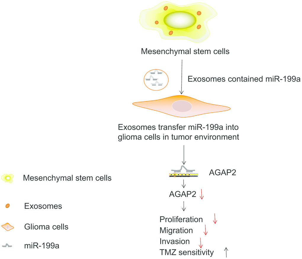 In summary, this study demonstrates that miR-199a, when delivered by hMSCs via the exosomes, is able to negatively regulate the expression of AGAP2, thereby inhibiting the proliferation and enhancing apoptosis of glioma cells (Figure 11). These findings are likely to provide a novel molecular target for glioma treatment. However, the specific mechanism by which AGAP2 exerts an influence on glioma cells still lacks clarification. The efficient delivery of the miR-199a from the MSCs to glioma cells via the exosomes still lack supporting data. Therefore, further studies are required to validate and substantiate our findings from this study.