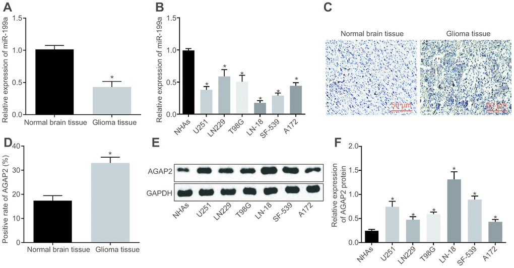 MiR-199a is poorly expressed while AGAP2 is highly expressed in glioma tissues and cell lines