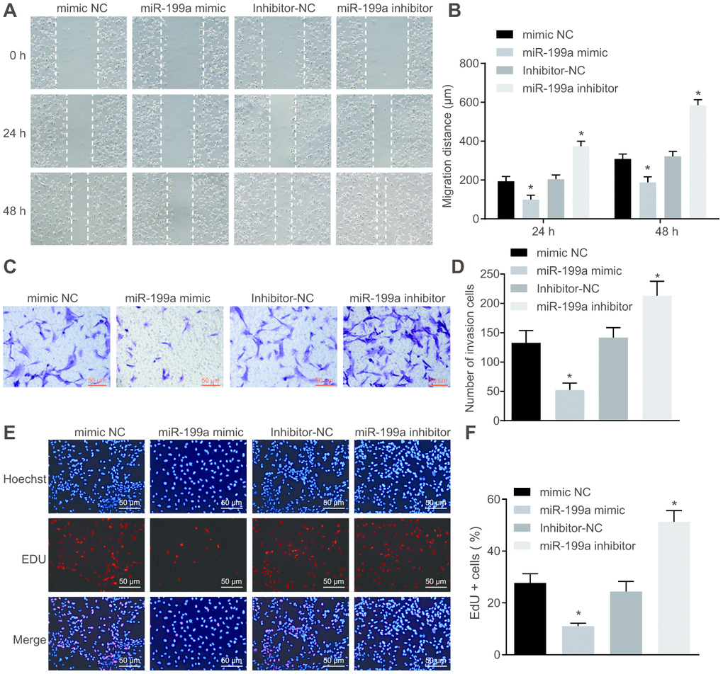 The functions of miR-199a over-expression on the proliferative, migrative as well as invasive abilities of glioma cells were analyzed by 5-ethynyl-2'-deoxyuridine (EdU) assay, scratch test and Transwell assay. The proliferative, invasive and migrative abilities of U251 cells decreased significantly when transfected with miR-199a mimic. However, we found a significant upregulation, when miR-199a was inhibited in U251 cells (Figure 3). Therefore, we demonstrated that overexpression of miR-199a inhibited the migration, invasion and proliferation of U251 cells, and thus plays a crucial anti-tumor role.